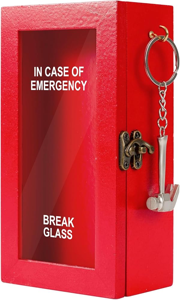 تصميم أنيق - الصندوق مطلي باللون الأحمر والزجاج الأمامي مكتوب عليه "في حالة الطوارئ" - "كسر الزجاج"، مما يؤكد بشكل فكاهي على ضرورة الموقف. يأتي مع 4 "زجاج" أكريليك قابل للتبديل وسلسلة مطرقة معدنية جديدة. تمنحك ألواح الأكريليك ذات التصميمات المختلفة مساحة أكبر للعب بإبداعك