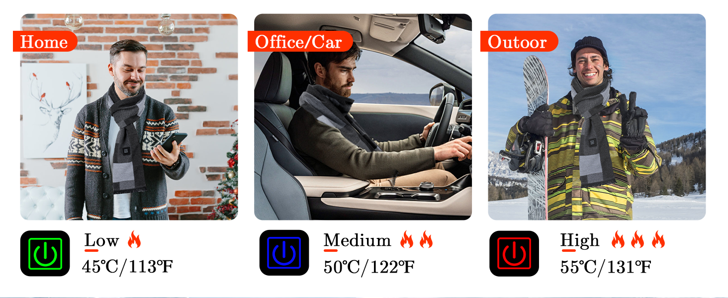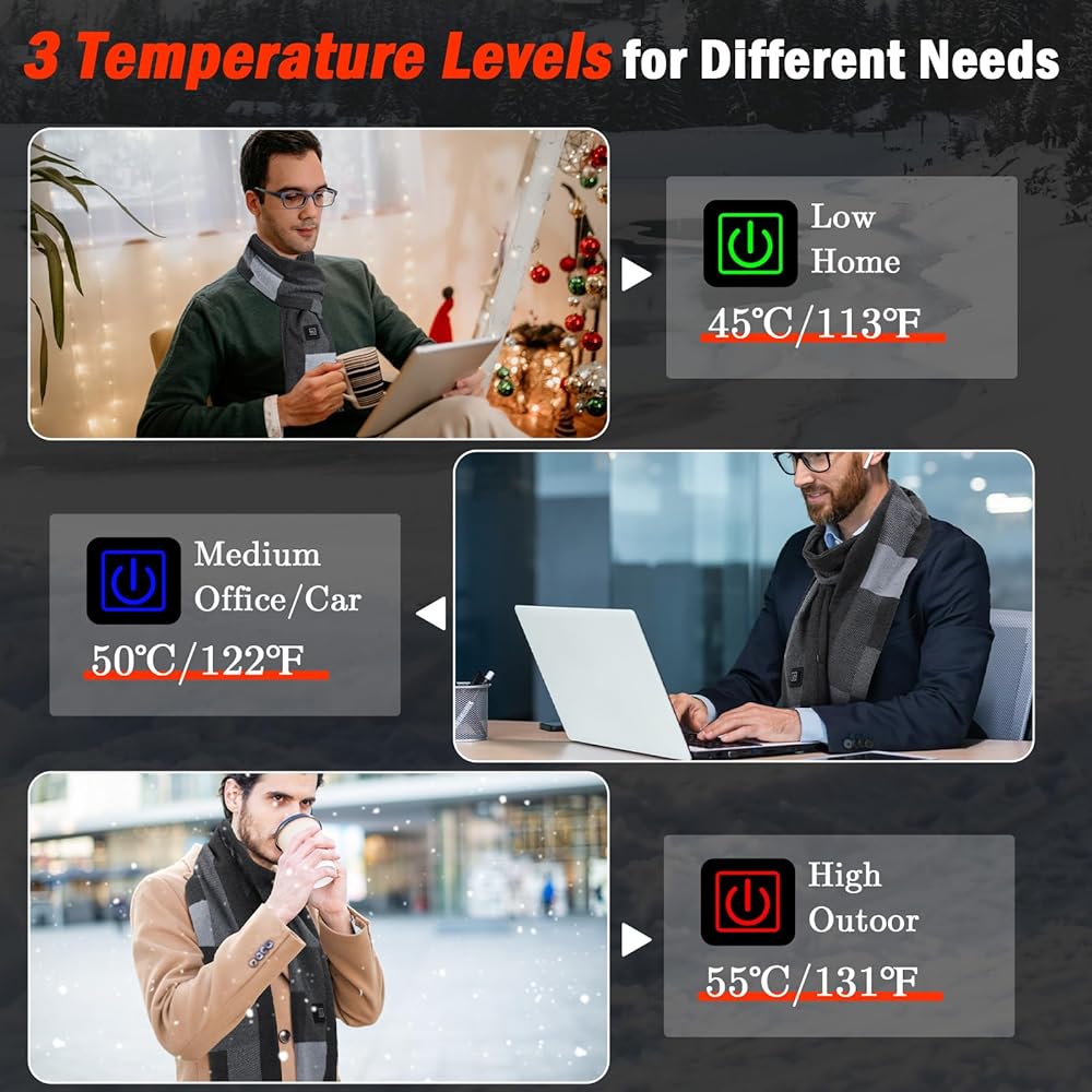【3 مستويات لضبط درجة الحرارة】- يتم تنشيط الوشاح الساخن بضغطة طويلة لمدة 3 ثوانٍ، ويشعر بالدفء في 10 ثوانٍ فقط. تستخدم وسادات تسخين الجرافين للتسخين، وتوليد حرارة ناعمة ومتساوية، تمامًا مثل الكمادات الساخنة. هناك 3 مستويات لضبط درجة الحرارة، فقط اضغط لفترة قصيرة، يمكنك ضبط درجة الحرارة. اللون الأحمر عالي الجودة (55 درجة مئوية)؛ اللون الأزرق درجة متوسطة (50 درجة مئوية)؛ اللون الأخضر منخفض الدرجة (45 درجة مئوية). (ملاحظة: يتم تسخين الجزء الأوسط فقط. حجم منطقة التسخين: 20 سم/7.81 بوصة × 7.5 سم/2.95 بوصة).
