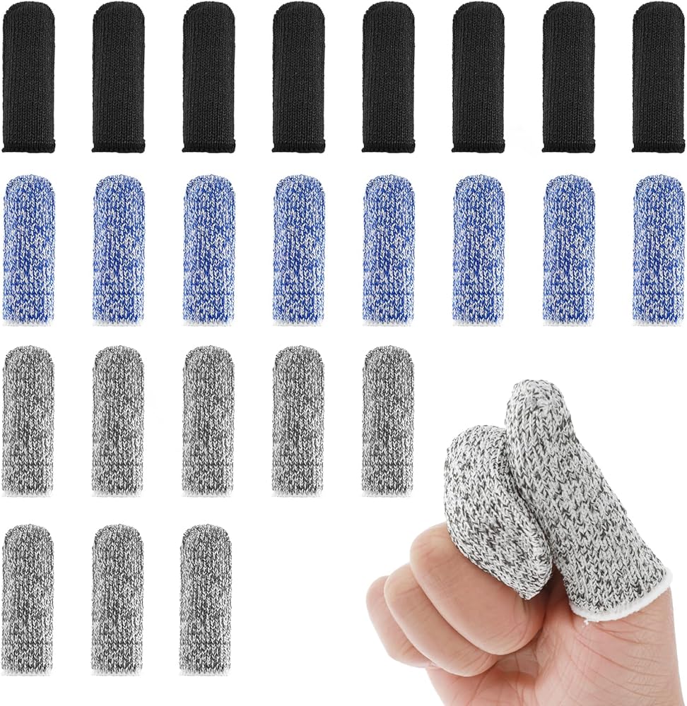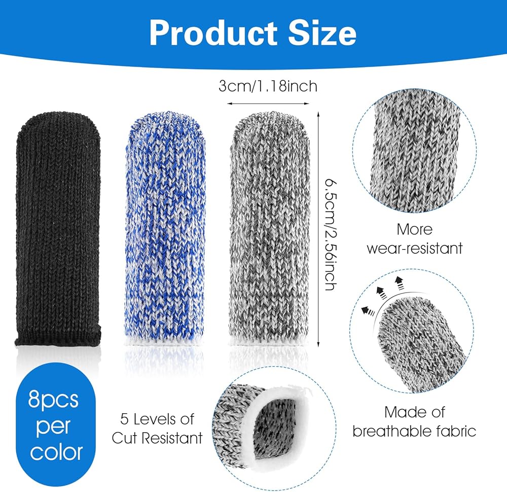 24Pcs Finger Cots: You will receive 24 finger cots in different colours. 8 pieces of blue finger cots, 8 pieces of black finger cots and 8 pieces of grey finger cots.Tips:As the finger cots are made of knitting technology, there are gaps between the finger cots, which may puncture your fingers if you use pointed objects such as needles, please use with care