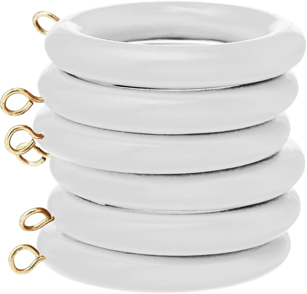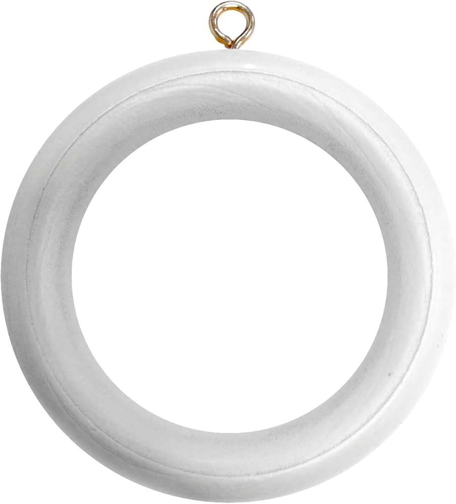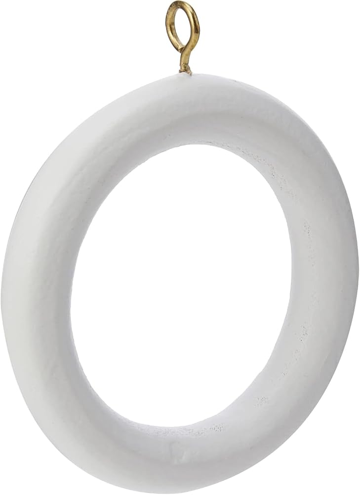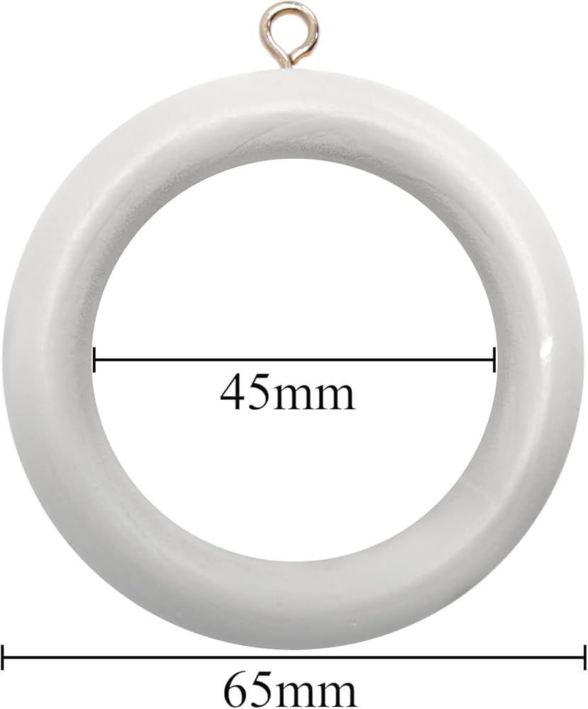 Pack of 24 x wooden curtain pole rod rings With screw eye Inner dimension 45 mm; outer dimension 64 mm Suitable for poles up to 45mm diameter Finish: White wood Manufacturer: Bulk Hardware Limited