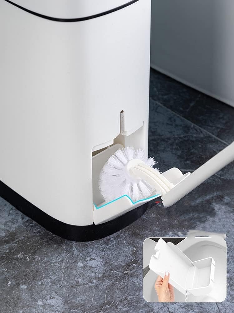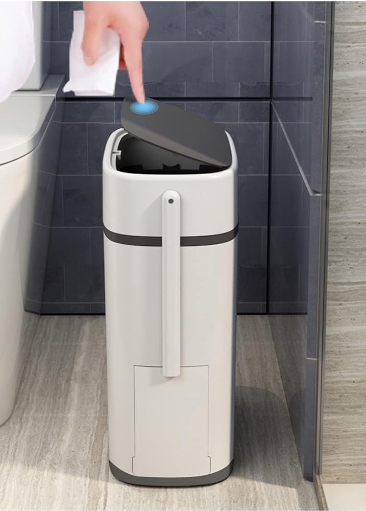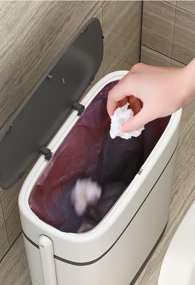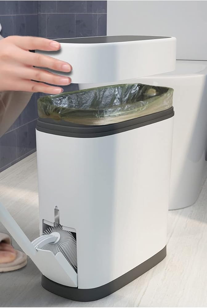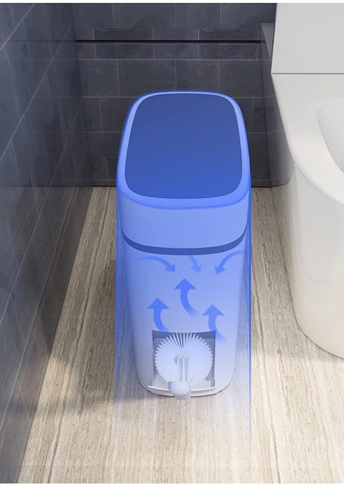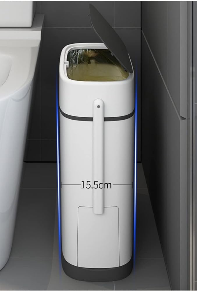 مناسبة لأي مكان: مع فتحة كيس القمامة، مناسبة للتحرك في المساحات الضيقة، تصميم نحيف يبدو رائعًا ويناسب بسهولة الفتحات الضيقة والمساحات الصغيرة. يناسب بشكل جيد الحمامات أو المكاتب أو أي مكان تكون فيه المساحة محدودة.
