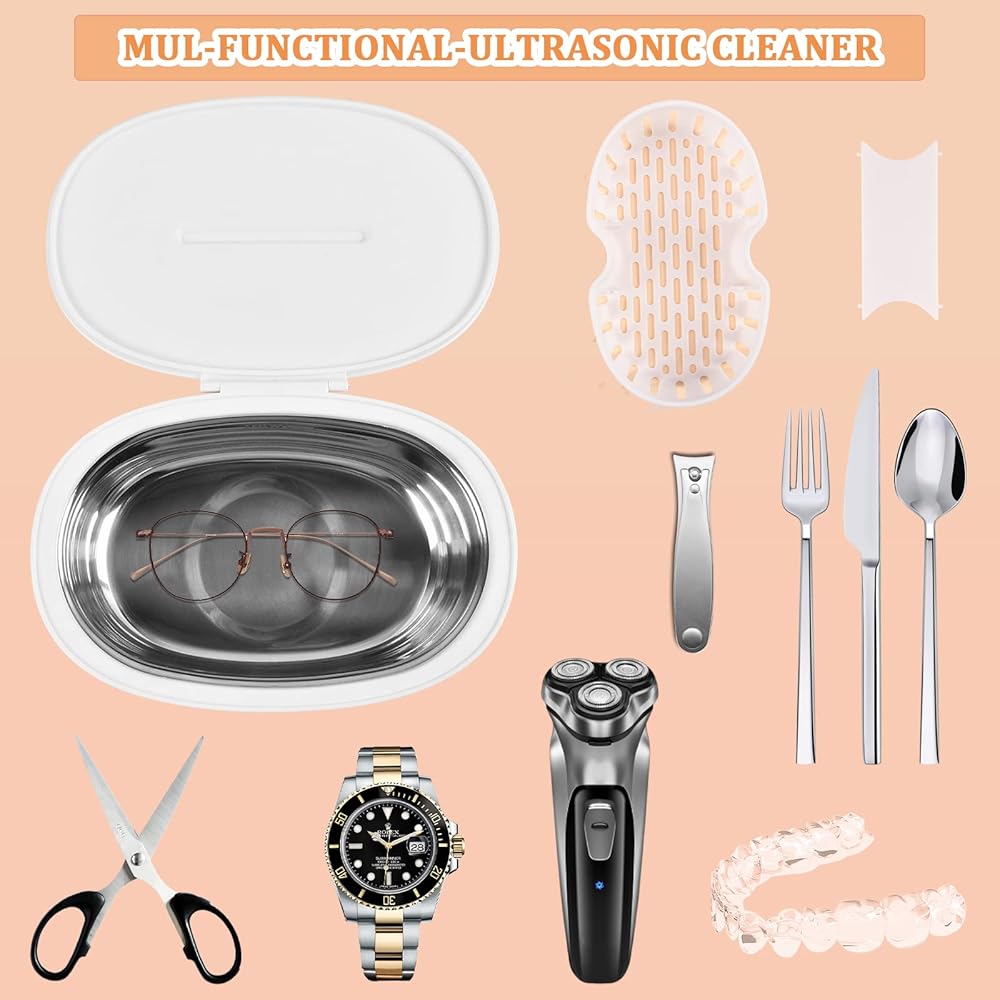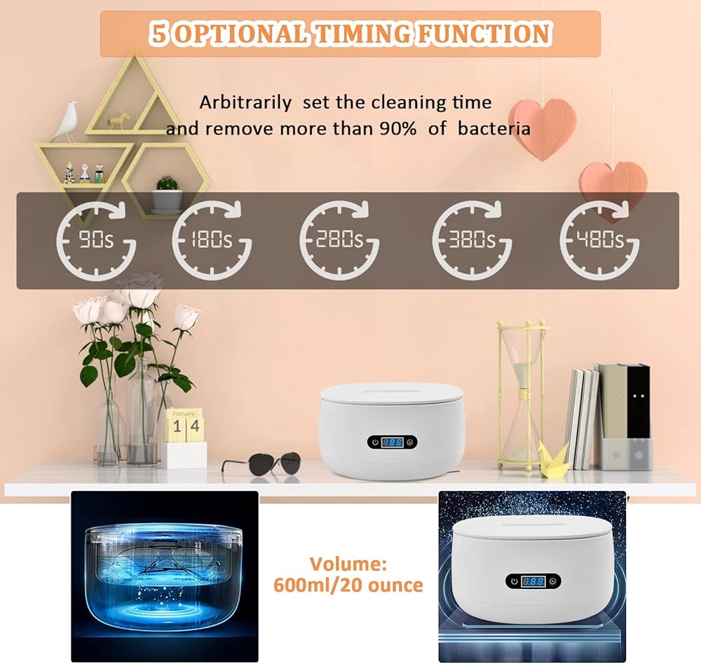 • ★غرفة كبيرة الحجم سعة 600 مل: 20 أونصة. الحجرة كافية لتنظيف عنصر واحد أو أكثر في وقت واحد، مما يوفر لك الوقت والجهد. تتضمن سلة غسيل وحامل ساعة للحفاظ على العناصر آمنة.