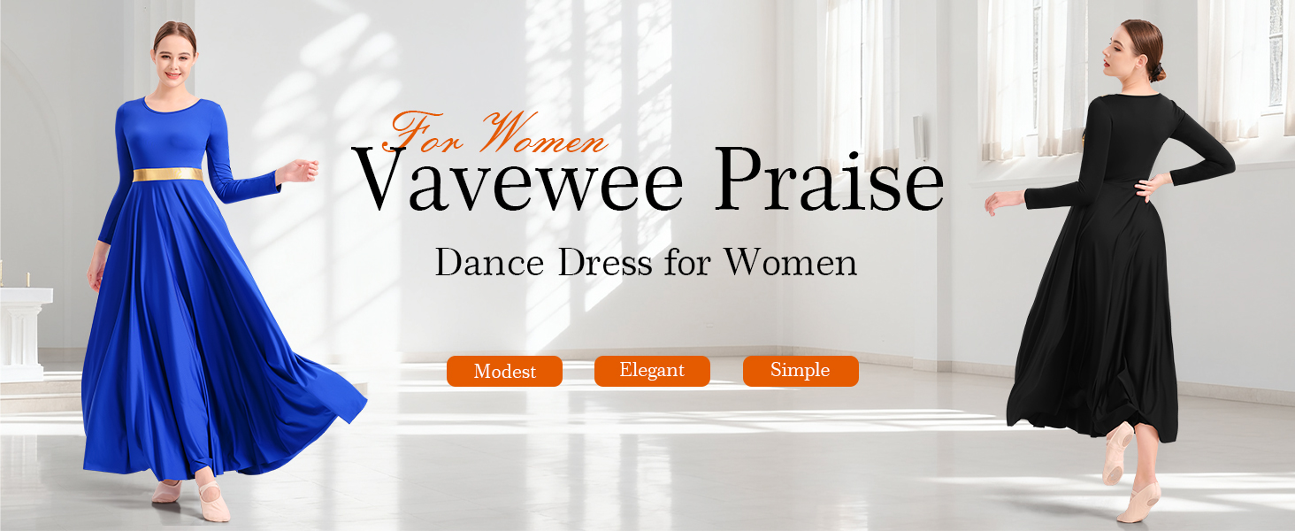 • نمط بسيط: فستان رقص مدح مزين بحزام خصر ذهبي، بسيط ولكنه أنيق وكريم. فستان رقص بأكمام طويلة بتصميم بسيط يمكن ارتداؤه في رقصات الكنيسة وكزي للهالوين أو الحفلات التنكرية.