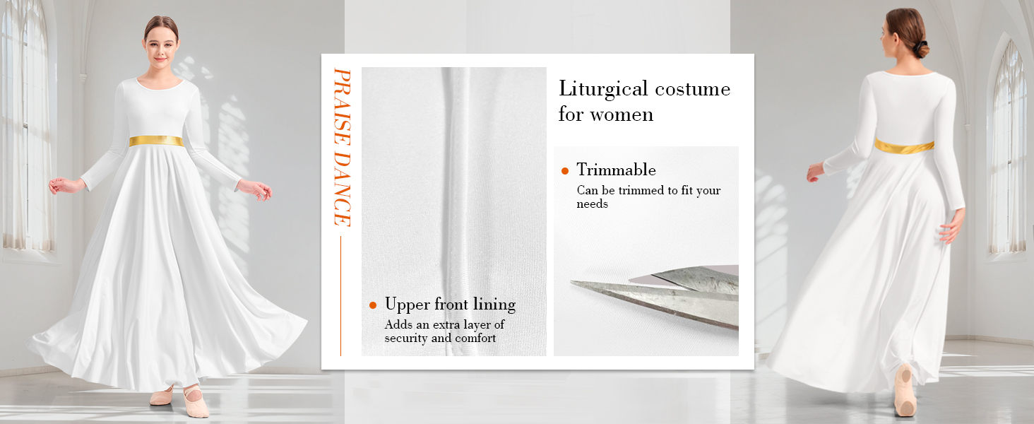 • ملابس الطقوس: فستان رقص نسائي طويل الأكمام مناسب لأنشطة الكنيسة، والمناسبات الدينية، والعبادة اليومية، واحتفالات المناولة، بالإضافة إلى الأنشطة الجماعية مثل عروض الكورال، ورقصات الثناء، والدراما الدينية، والاحتفالات الدينية.