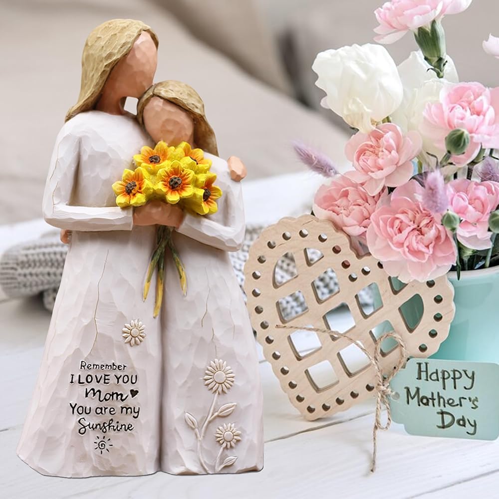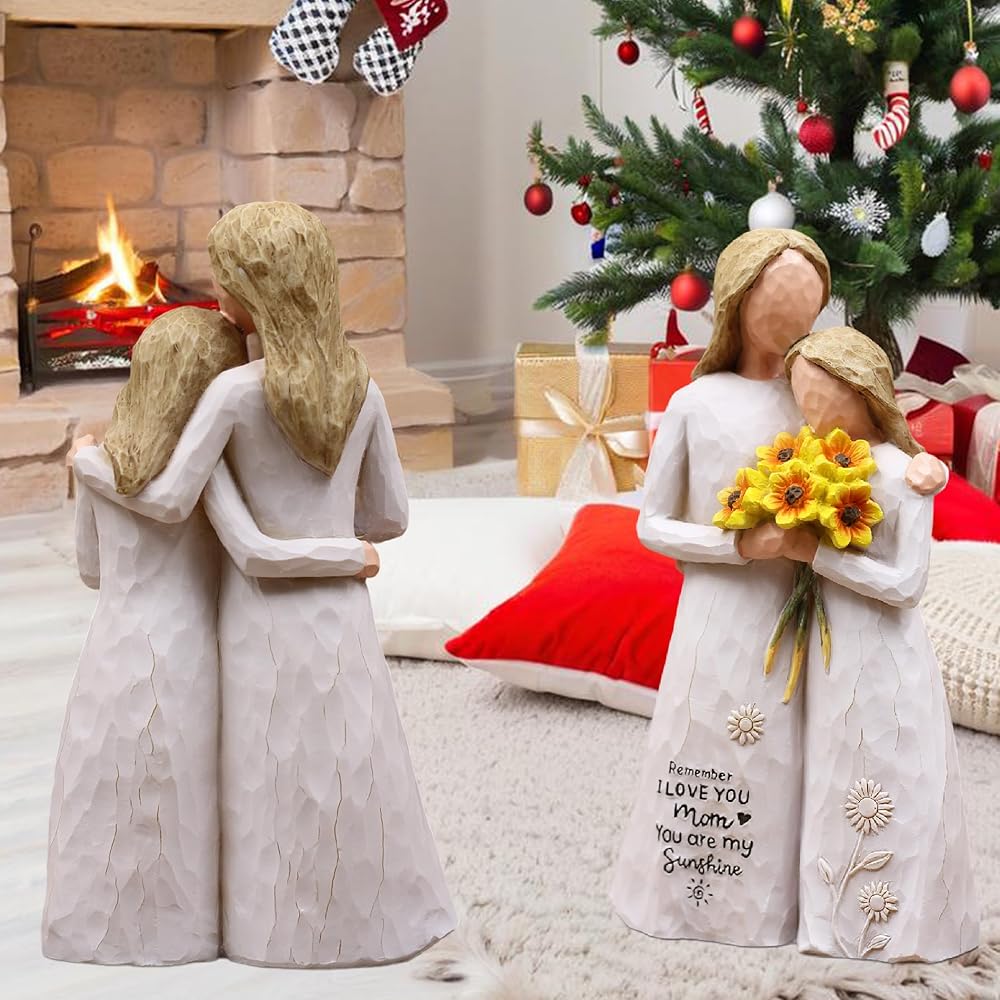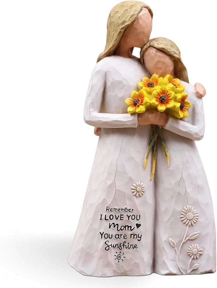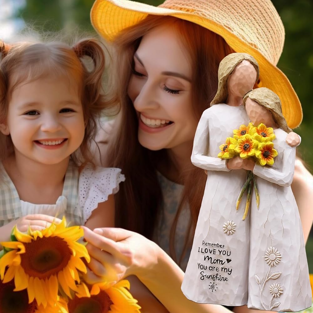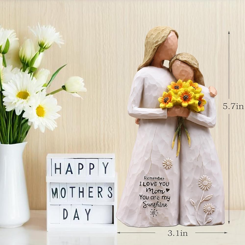 هدايا عيد ميلاد للأم من ابنتها: هذا التمثال الراتنجي مقاس 5.7 بوصة يصور أمًا تحتضن ابنتها وتحمل عباد الشمس. تتميز فساتينها المتدفقة برسائل منقوشة: "تذكر أنني أحبك يا أمي" و"أنت أشعة الشمس الخاصة بي"، تكملها زخارف عباد الشمس والشمس الرقيقة. هدية خالدة لعيد الأم أو أعياد الميلاد