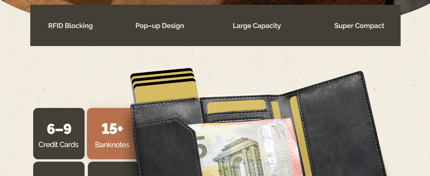 وصول سريع وسعة كبيرة - يجب أن يكون التبخير في محفظتك القديمة شيئًا من الماضي. تعمل الآلية التلقائية المميزة الخاصة بنا على إخراج بطاقاتك بالترتيب بنقرة زر واحدة. احتفظ بـ 5 بطاقات ائتمان في علبة البطاقات المنبثقة. جيب للعملات المعدنية بسحاب في الخلف لتخزين العملات المعدنية والمفاتيح بشكل آمن، بالإضافة إلى جيبين إضافيين في محفظة Apple Airtag التي يمكن استخدامها للبطاقات الأخرى (رخصة القيادة، وبطاقة التأمين، إلخ)، وحجرة لحمل القليل من النقود أو الفواتير ونافذة مرئية لبطاقة الهوية.