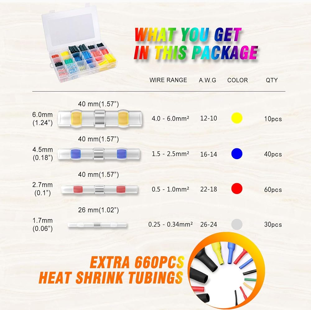 -- 10 × موصلات انكماش صفراء: القطر 6.0 ملم، المقطع العرضي للكابل: 4.0-6.0 ملم² (AW.G: 12-10)؛