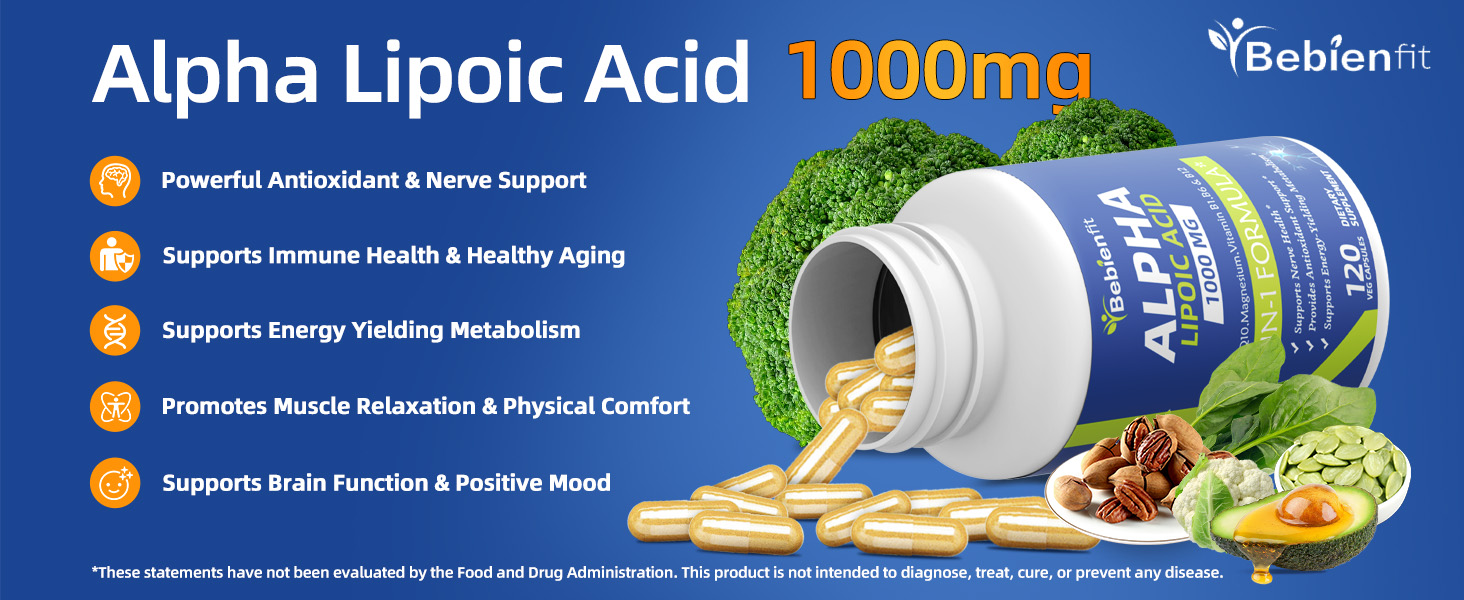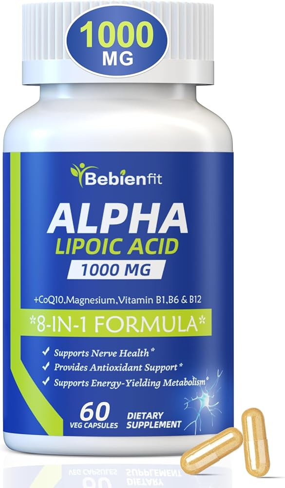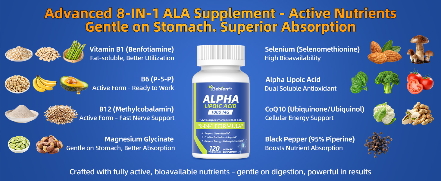 مركب 8 في 1 للاعتلال العصبي وصحة الأعصاب - حمض ألفا ليبويك 1000 مجم + فيتامينات ب النشطة (ب1، ب6، ب12) + مرافق الإنزيم Q10 + جليسينات المغنيسيوم + السيلينيوم + مستخلص الفلفل الأسود: تم تركيبه علميًا لدعم راحة الأعصاب ووخز اليد والقدم ووظيفة الأعصاب بشكل عام. تعمل جميع العناصر الغذائية الثمانية المتوفرة بيولوجيًا بشكل تآزري من أجل صحة الأعصاب ودعم مضادات الأكسدة.