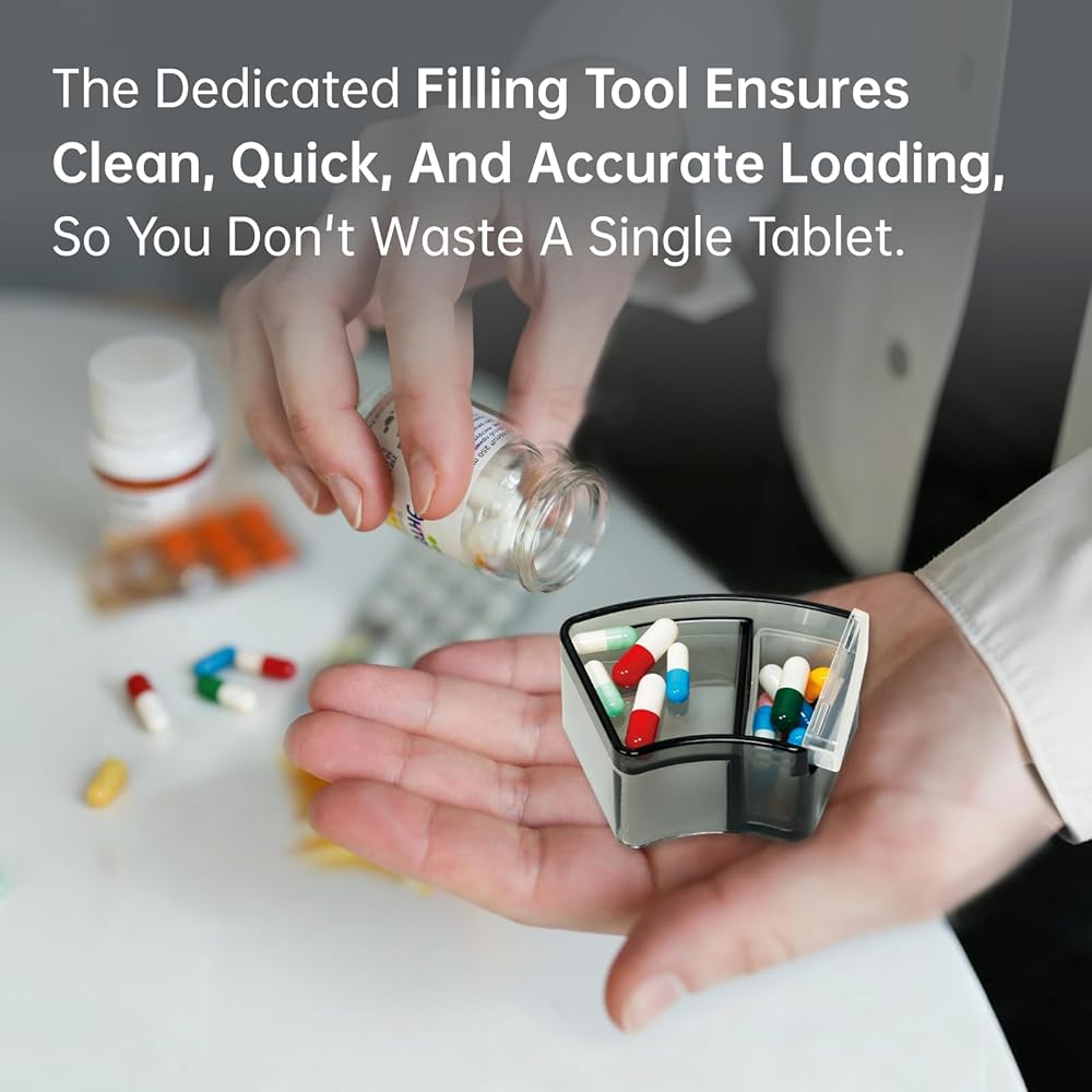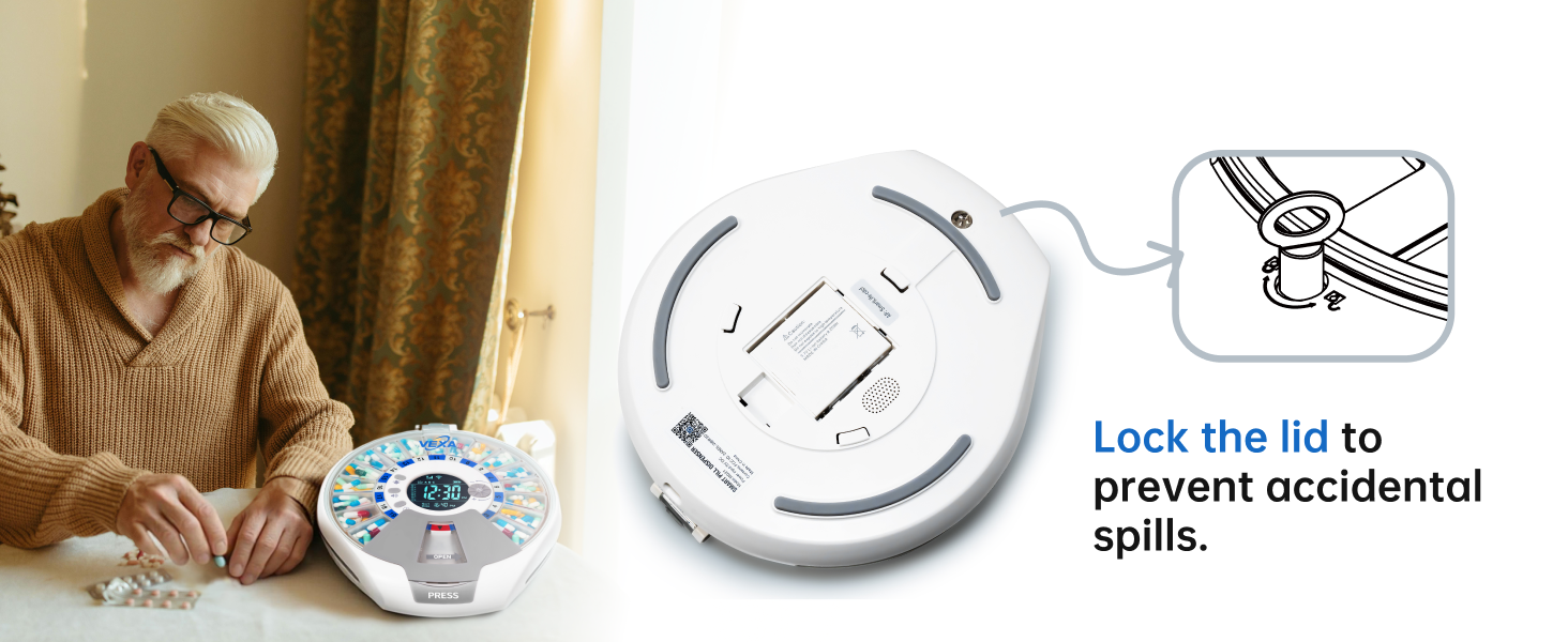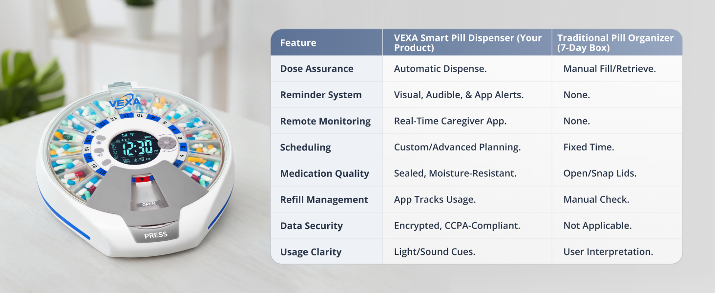 موزع حبوب منع الحمل الذكي VEXA VitaMate Pro 21 مع دوران تلقائي، وحاويات حبوب منع الحمل المرتفعة، وتنبيهات الصوت والضوء، وتذكير الدواء الذي يتم التحكم فيه من خلال التطبيق ومتتبع للأقراص والكبسولات والمكملات الغذائية