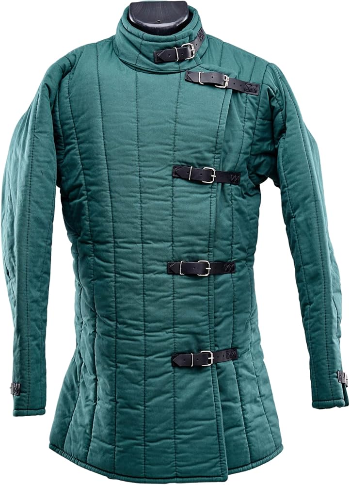 When you want excellent protection during battle, the Arthur Canvas Gambeson Set is your ideal solution. The padded armor includes a gambeson, tassets, and sleeves in a versatile set that can be worn in different combinations. The padded gambeson can be worn under many kinds of armor to help prevent rubbing and pinching. The tall collar increases comfort around the neck, as well. The armor padding is stitched in a diamond or straight verticle pattern that allows movability and keeps the padding in place. The front of the medieval gambeson is fastened with four buckled straps. With versatility, this gambeson is both pleasant to the touch and stylish and great for costumes and re-enactments