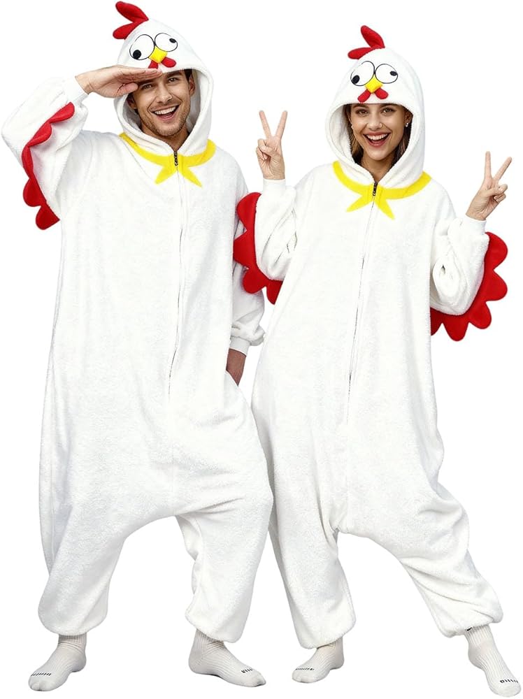 التصميم: بيجامة مضحكة من قطعة واحدة من الدجاج الأبيض، الشكل الحقيقي واللطيف يمنحك الراحة والسعادة