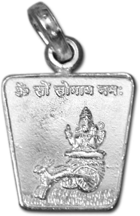 Chandra (Moon Planet) Yantra Locket Beautifully Designed in pure silver. Moon Pendant on one side and Chandra Deity photo on other side. If in your rashi planet moon not to going well, you need to wear it. It help to remove all side-effect those came for that. It is very much beneficial to lift up your fulfilment, attraction, charm, pull and charisma. That why it play big role to get incredible success. It is very sacred locket and known form making the wishes true. Chandra Yantra is installed and worshipped in order to appease planet Moon as well as to calm it if the moon is giving negative effects. The Planet Moon is one of the most prime planets in any Horoscope. Moon is considered as a planet but in actuality, Moon is a satellite of planet Earth and it revolves around Earth completing one revolution in around 27 days. Astrologically, it is considered as Queen in the planets (Sun is regarded as King). The planet Moon governs our Emotions, Will Power, Wealth, Health as well as all our thoughts. A person having a strong Moon (Moon in its own Sign - Cancer, Moon in its exaltation sign Taurus or Moon being aspected by naturally benefic planets like Jupiter) is strong in respect to his Will Power and Decisions & he is always a Positive thinker and never falls prey to negative states of mind like Depression. A person having a weak Moon can suffer from diseases of chest, lung infections, tuberculosis, blood related problems, mental problems as well as depression and diseases related to digestive system like diarrhea, dysentery, etc.