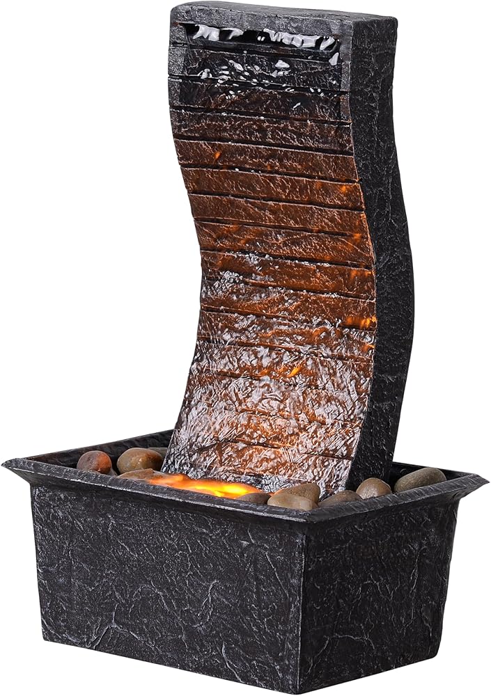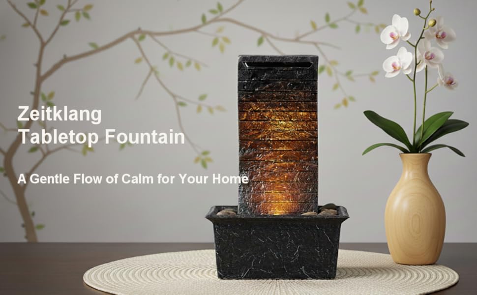 توهج LED دافئ ومريح: تضيء إضاءة LED الناعمة المياه المتدفقة وتسلط الضوء على منحنيات النافورة الأنيقة، مما يلقي توهجًا مهدئًا يعزز الاسترخاء ويحول مساحتك إلى ملاذ هادئ.