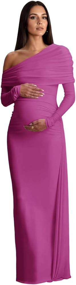 Features:Showcasing an asymmetric neckline and ruched detailing that enhances your growing bump with style.A dramatic sash cascades from waist to floor adds soft femininity to photos.