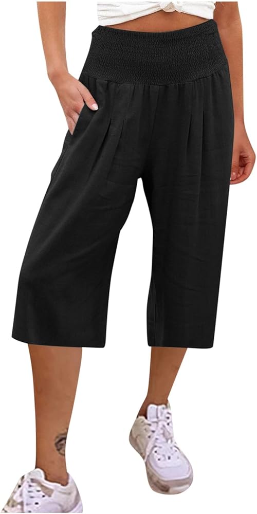 بنطال كتان كاجوال - بنطال كابري كتان للنساء، ساق واسعة، خصر مرتفع، حزام خصر مرن عالي، رباط، جيبان جانبيان، سهل الارتداء، بنطال بيجامة يوجا من الكتان الناعم. اشعري بالراحة طوال اليوم مع مقاسنا الفضفاض.