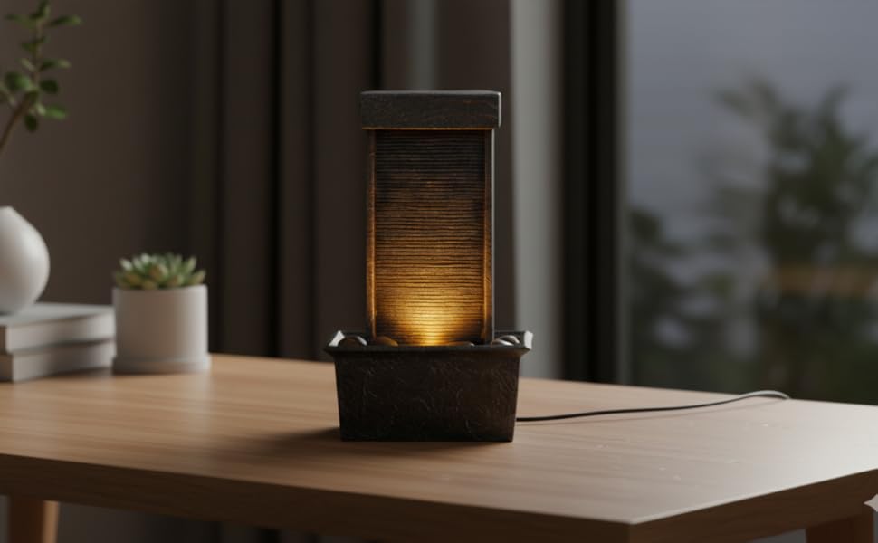 توهج LED دافئ: يضيء ضوء LED المدمج تدفق المياه بهدوء، مما يعزز التأثير الهادئ ويسلط الضوء على تصميم النافورة الأنيق. مثالي للأمسيات أو إعدادات الإضاءة المنخفضة.