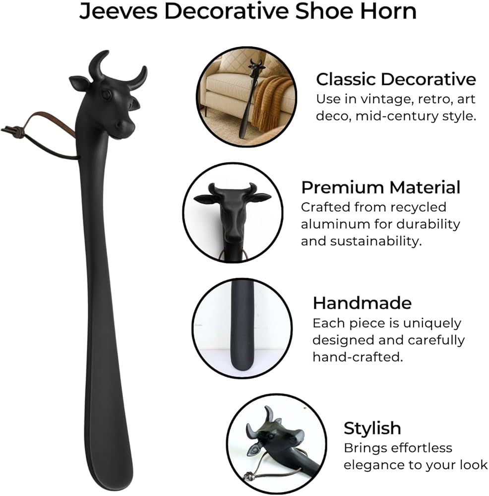 Add a touch of character and craftsmanship to your daily routine with the JEEVES Long Cow Shoe Horn in matte black. At 22 inches tall, this elegant shoehorn is more than just practical, it's sculptural decor for the refined home. The detailed cow head handle adds handmade artisan style, while the powder-coated finish ensures durability and a smooth, stylish surface. Made from recycled aluminum, each JEEVES shoe horn is hand cast and finished using traditional methods, ensuring no two are exactly alike. Whether placed by your boots in the entryway or leaned beside a dresser, it offers a seamless blend of function and design. Ideal for men's bedrooms, dressing rooms, or home offices, this shoehorn also makes a standout gift for him, especially for those who love classic, vintage-inspired pieces with a modern twist. Useful, unique, and undeniably cool, JEEVES turns a small moment into a polished experience.