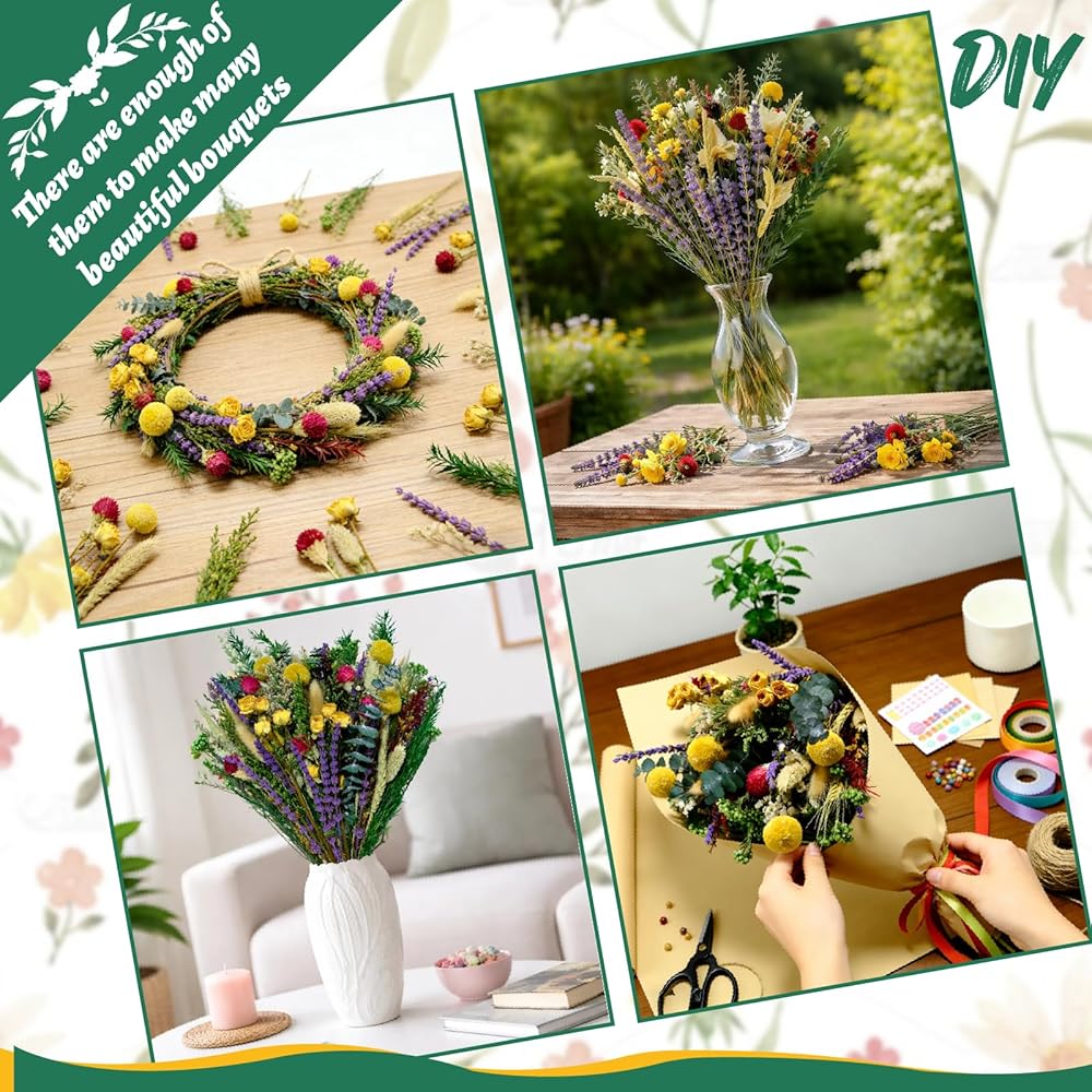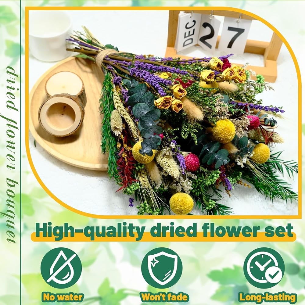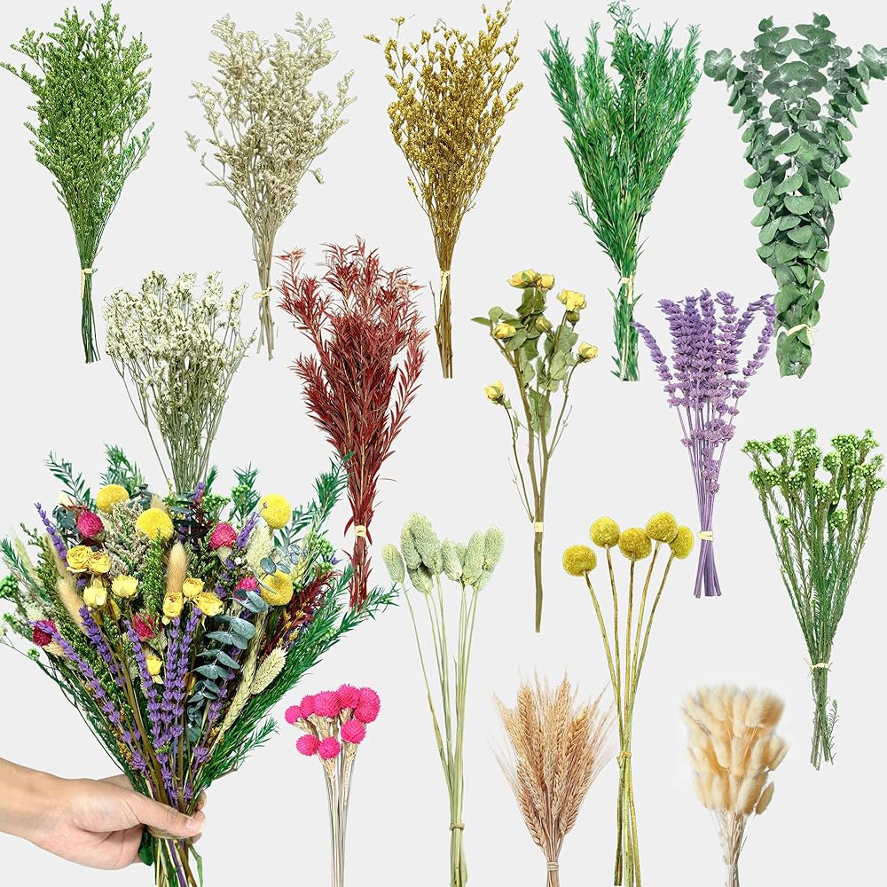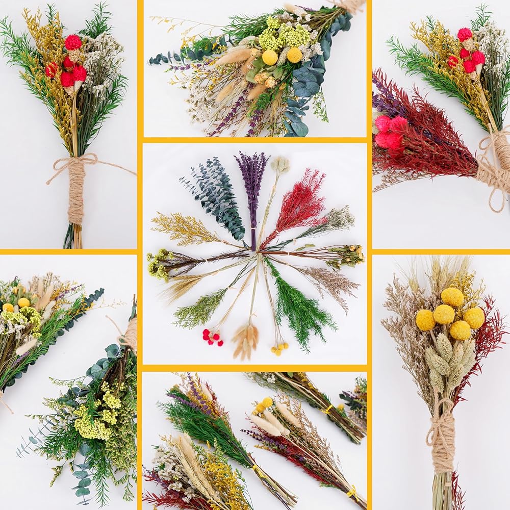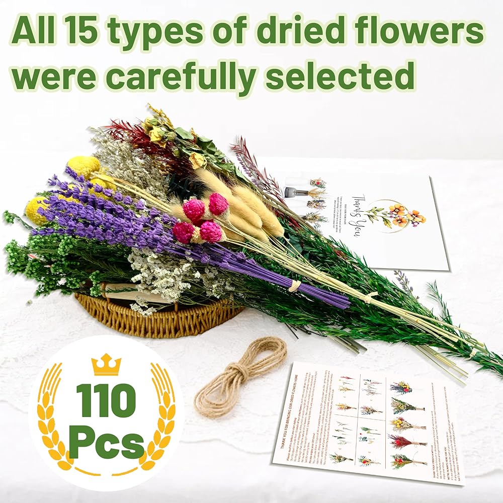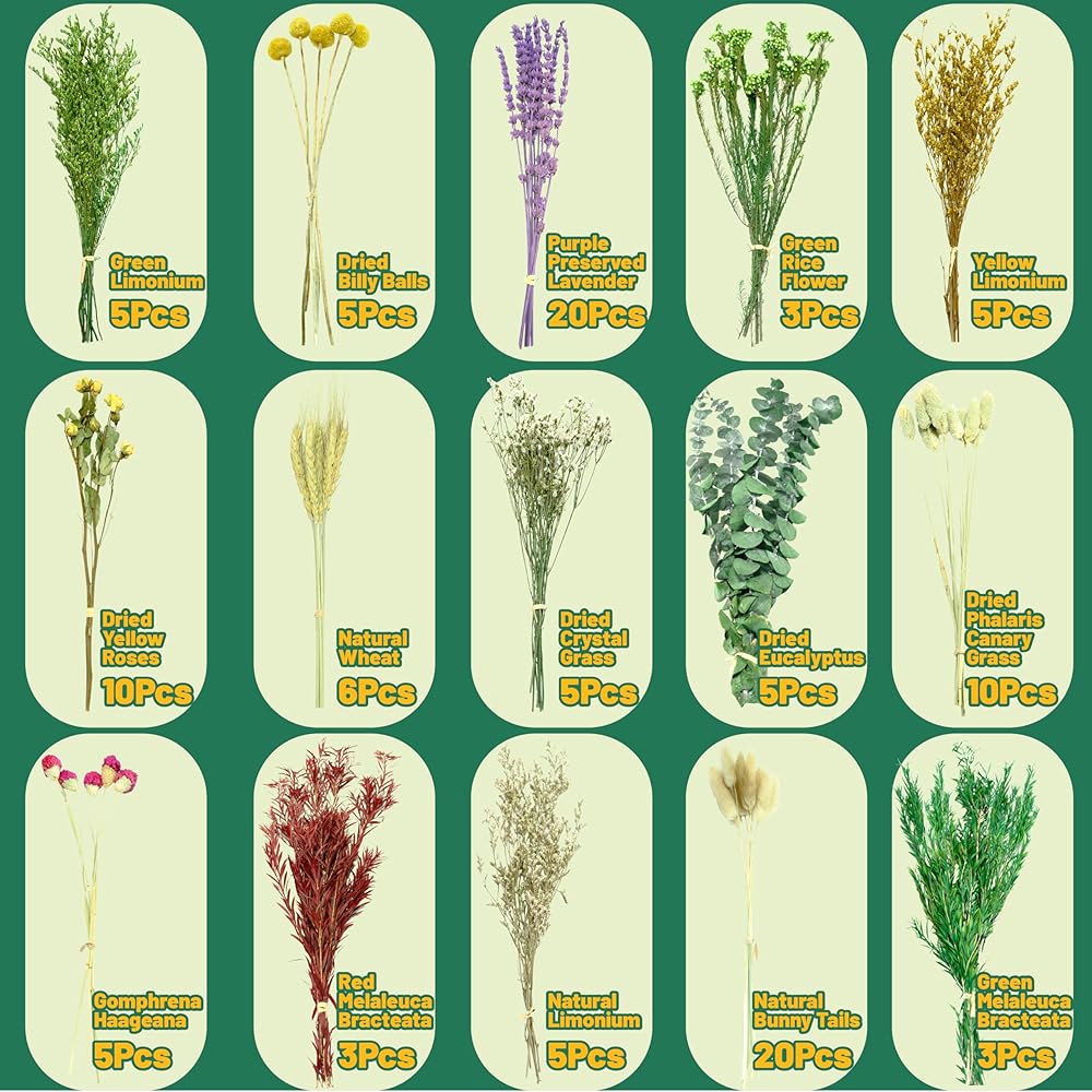 • 15 نوعًا من الزهور عالية الجودة: مجموعة الزهور المجففة تحتوي على 20 لافندر، 5 كرات بيلي مجففة، 10 ورود صفراء مجففة، 5 ليمونيوم أصفر، 6 قمح طبيعي، 3 ميلالوكا براكتيتا خضراء، 3 زهور أرز خضراء، 20 ذيل أرنب طبيعي، 10 عشب جوهرة، 5 جومفرينا هاجينا، 5 أوكالبتوس، 3 ميلاليوكا حمراء بركتيتا، 5 ليمونيوم، 5 عشب كريستال، 5 ليمونيوم أخضر، إجمالي 110 قطعة.