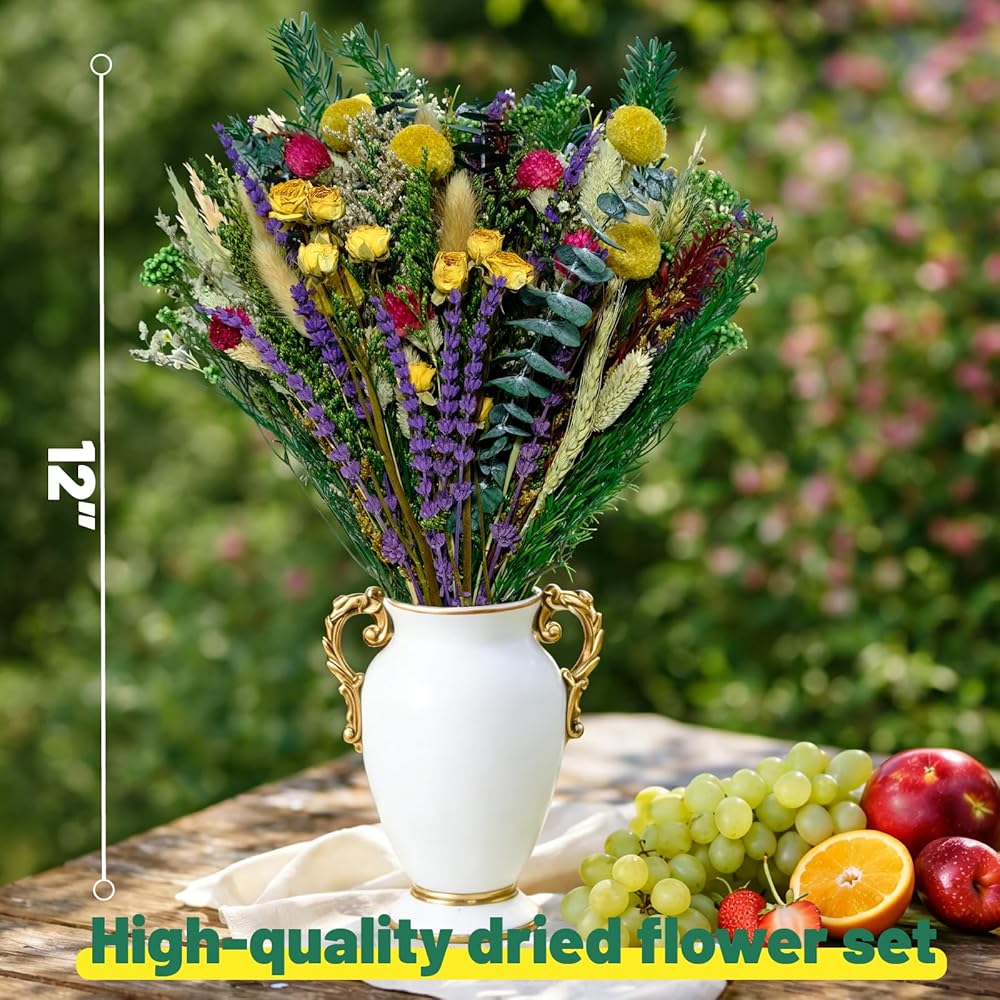 باقة زهور مجففة 110 قطعة - مجموعة زهور محفوظة من 15 نوعًا مع 12 بوصة لافندر وأوكالبتوس وذيول أرنب وورود مجففة لديكور المنزل وحفلات الزفاف وحرف الهدايا والمزهرية وتشكيلة الزهور المصنوعة يدويًا