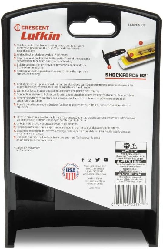 شفرة مزدوجة الجوانب مطبوعة بمقياس عمودي سريع القراءة على الجانب السفلي للقياسات العلوية والقياسات التي يصعب الوصول إليها، الأرقام والزيادات الكبيرة تجعل أشرطة القراءة أسهل في القراءة، توفر نقطة الربط الفولاذية قدرة أمان أكبر عند العمل على الارتفاع، طبقة شفرة واقية أكثر سمكًا بالإضافة إلى حاجز واقي إضافي في أول 6 انش توفر متانة أكبر للشريط، ويمكن أيضًا استخدام نقطة الربط لخدش ورسم الأقواس أثناء التخطيط، عريض إيه, يوفر شفرة سمكا 1 7 أقدام من الوصول، شوك فورس جي 2، قوة الصدمات، قوة الصدمات، قوة الصدمات، شوك فورس، شوك فورس، شوك فورس، شوك فورس، خطاف طرفي مطلي بالماس، شفرة مزدوجة الجوانب، شريط قياس مزدوج الجوانب، شريط طاقة، وصول 17 قدم، قياس الإضاءة المنخفضة، عين ليلية، عين ليلية، نايت اي، شريط قياس مغناطيسي، لمسة نهائية سوداء غير لامعة مع علامات خضراء توفر رؤية محسنة في ظروف الإضاءة المتنوعة ق, يحسن خطاف النهاية المغناطيسي يحسن خطاف تتميز بإمساك أفقي وجانبي على أي سطح معدني، مثالية لقياسات شخص واحد، خطاف طرفي مطلي بالألماس يحمي الجزء الأمامي من الشريط بالكامل ويمنع الشريط من التمزق والتمزق، يوفر تصميم الهيكل المدعوم الحماية ضد السقوط من الارتفاعات القصوى، مشبك الحزام المعاد تصميمه يجعل من السهل وضع الشريط على الجيب أو الحزام أو الحقيبة.