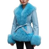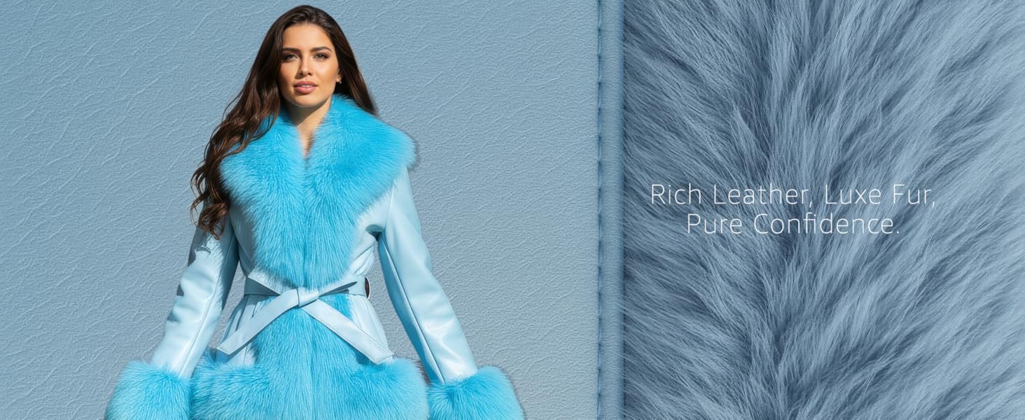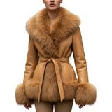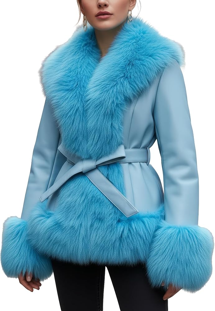 - تصميم فاخر: سترة من الجلد النباتي بطول الخصر تتميز بزخرفة من الفرو الصناعي الفاخر على طول الياقة وأساور الأكمام لنمط الشتاء الأنيق