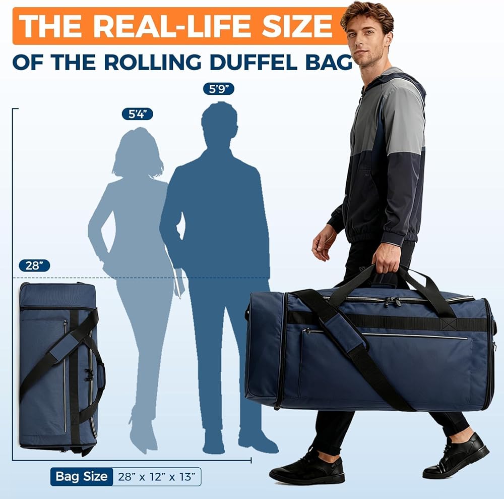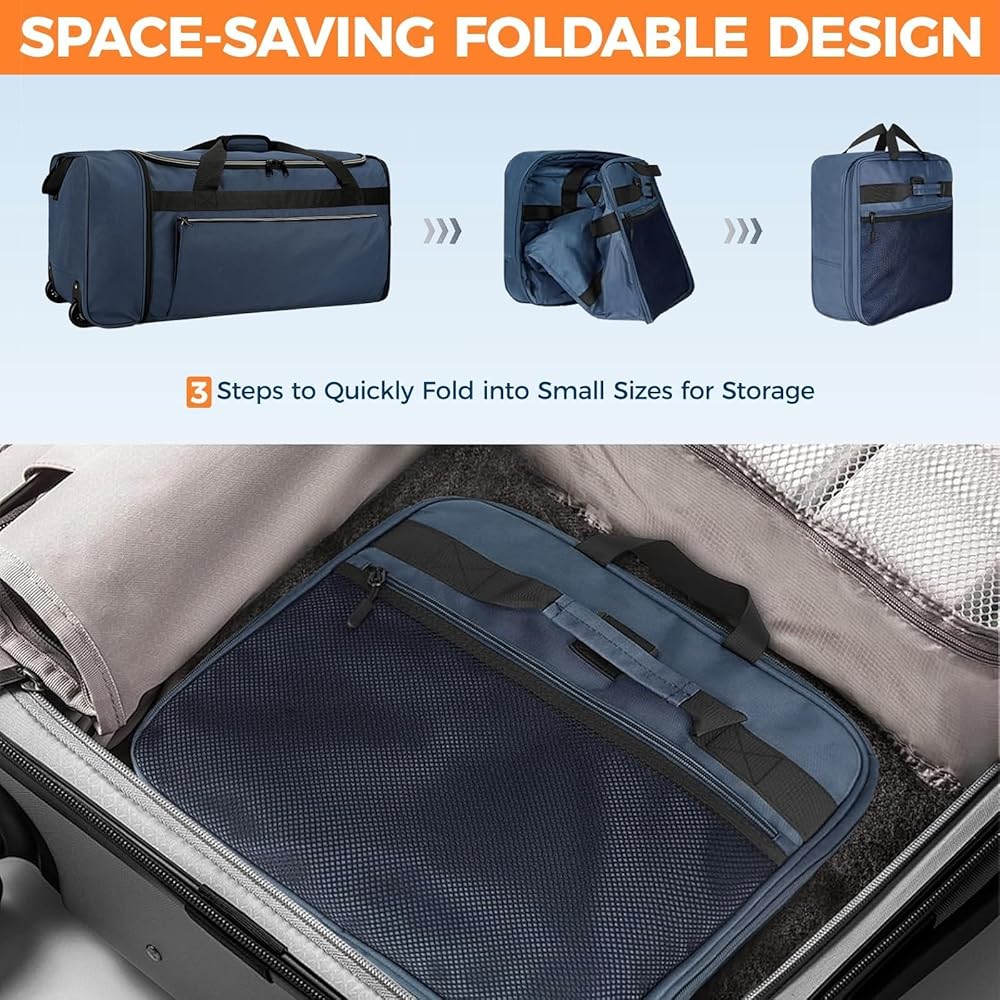 تصميم قابل للطي - قياس 28 بوصة (طول) × 12 بوصة (عرض) × 13 بوصة (ارتفاع) ووزن 1.1 رطل فقط، يمكن طي هذه الحقيبة المتدحرجة ذات العجلات بسرعة إلى حجم مسطح صغير الحجم 12 بوصة (طول) × 4 بوصة (عرض) × 13 بوصة (ارتفاع). يمكن وضعها بسهولة في أمتعتك كحقيبة احتياطية "فقط في الحقيبة"، مثالية لتخزين الهدايا التذكارية أو الضروريات غير المتوقعة أثناء رحلتك.