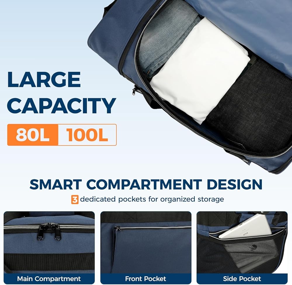 سعة كبيرة 80 لتر - تتميز بفتحة واسعة على شكل حرف U في القسم الرئيسي، وتوفر هذه الحقيبة الدوارة مساحة تخزين تبلغ 80 لترًا، وتتسع بسهولة لمعدات السفر لمدة 3-4 أيام. فهو يسمح لك بالوصول السريع إلى متعلقاتك دون الحاجة إلى البحث عنها. بالإضافة إلى ذلك، يساعد الجيب الأمامي بسحاب والجيب الشبكي الجانبي بسحاب على الحفاظ على تنظيم أغراضك الأساسية.