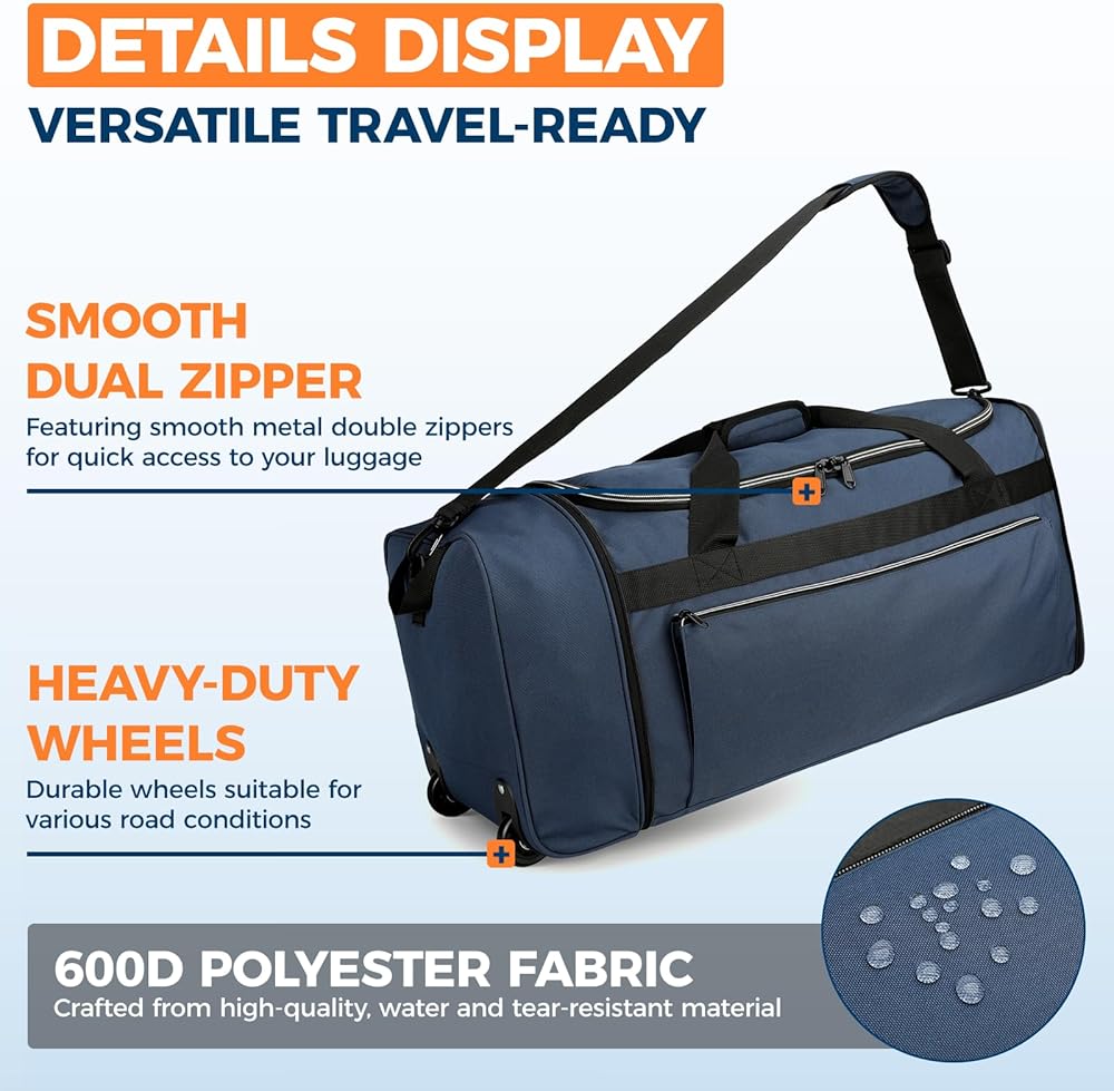 مادة متينة - مصنوعة من البوليستر المقاوم للماء 600D والمقاوم للتمزق، هذه الحقيبة ذات العجلات متينة ومقاومة للتآكل وسهلة التنظيف بالمسح. الجزء الداخلي مبطن بمادة PVC لحماية مقتنياتك من المطر الخفيف والرذاذ والتآكل اليومي.