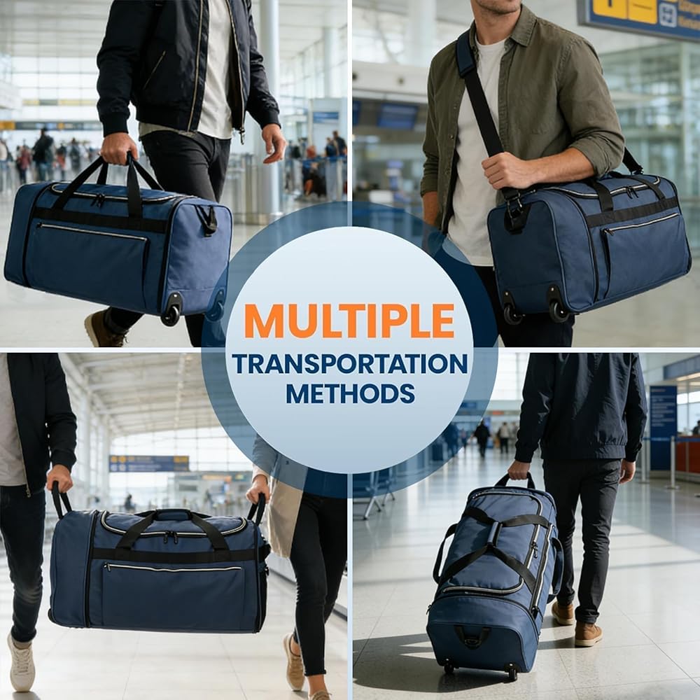عجلات شديدة التحمل وقاعدة معززة - حقيبة السفر القابلة للطي مجهزة بلوحة قاعدة معززة قابلة للطي لتعزيز المتانة وطول العمر. كما أنها تتميز بعجلتين للخدمة الشاقة موضوعتين داخل أغلفة واقية للعجلات، مما يضمن سهولة الحركة لسفر مريح وسهل.