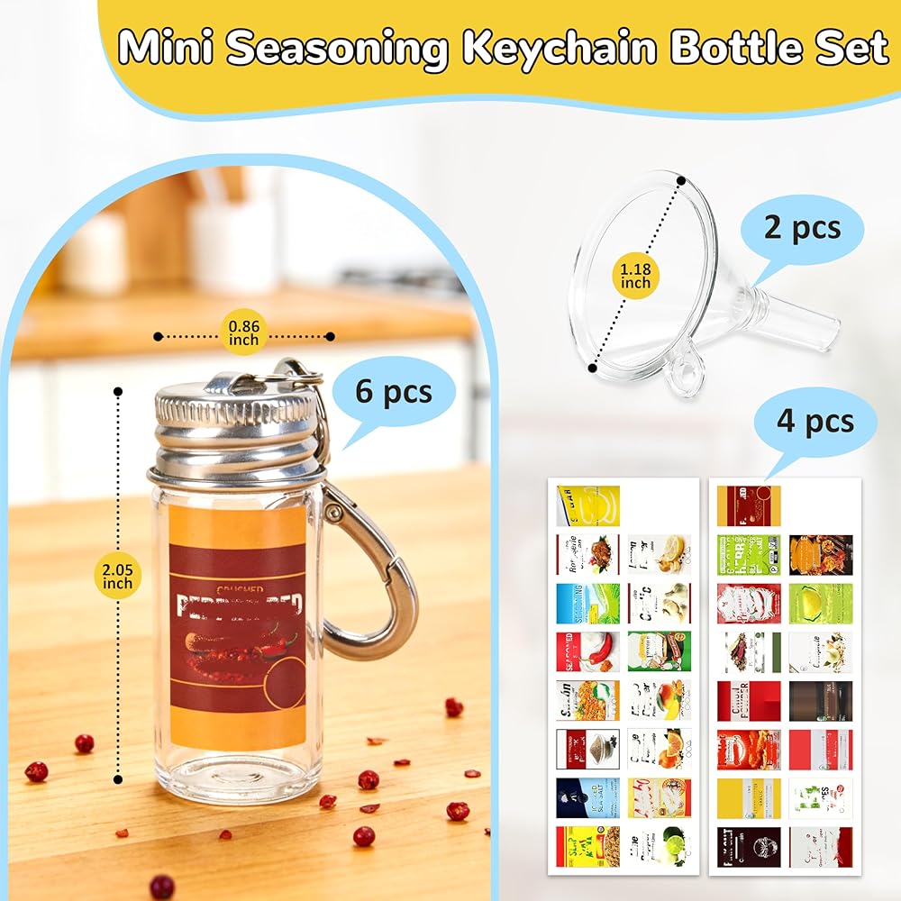 مجموعة زجاجات توابل صغيرة من FANTOVO، 6 قطع من مرطبانات التوابل الفارغة مع مسارات صغيرة وملصقات DIY من 30 نمطًا، حاملات سلسلة مفاتيح محكمة الغلق أثناء التنقل للسفر وفي الهواء الطلق وصناديق الغداء والتخييم، إجمالي 6+2+4.