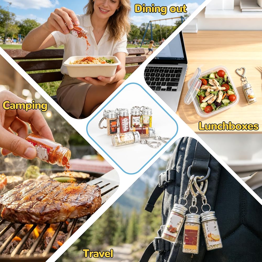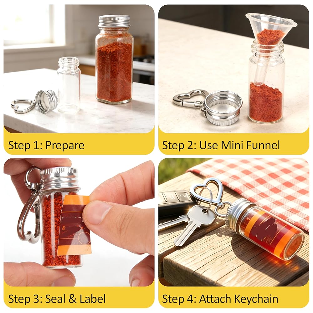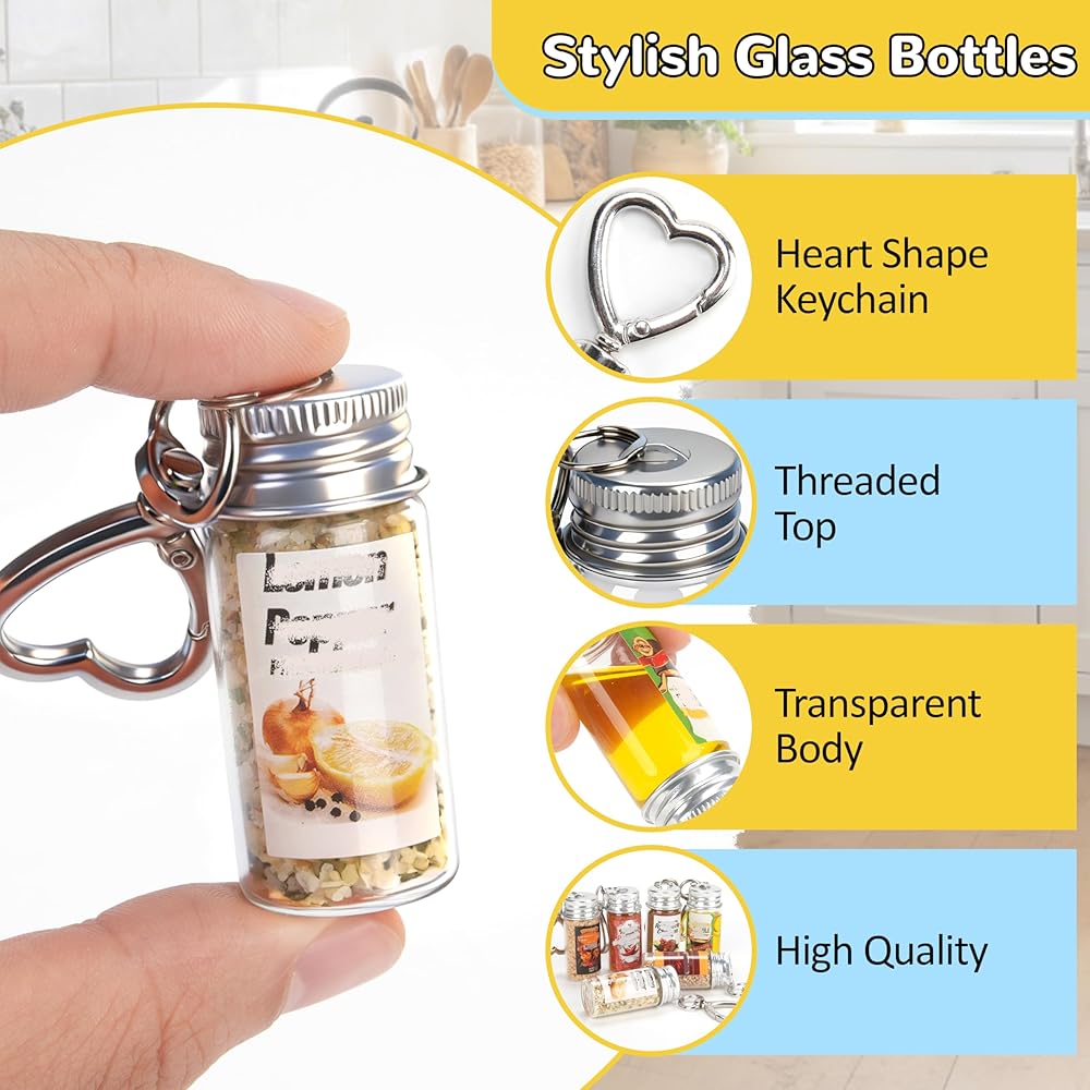 ✨رفيق محمول: كل زجاجة سلسلة مفاتيح تحمل 10 مل، ويتميز القمع الصغير بفتحة تعليق - قم بربطها بالمفاتيح أو حقائب الظهر أو أدوات المائدة. من السهل تعبئتها مسبقًا بالتوابل الشائعة مثل الملح والفلفل ومسحوق الثوم، مما يلغي الحاجة إلى حاويات كبيرة الحجم.