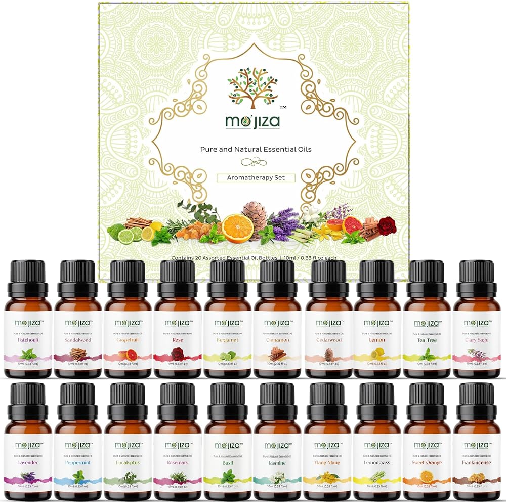 مجموعة هدايا الزيوت العطرية النقية للعلاج العطري من موجيزا، 20 زيتًا - خشب الصندل، الورد، البرغموت، الباتشولي، الجريب فروت، المريمية المتصلبة، الياسمين، اللافندر، وأكثر من ذلك، 10 مل لكل منها. كوشير معتمد، نباتي ولم يتم الإساءة إلى الحيوانات لتصنيعه