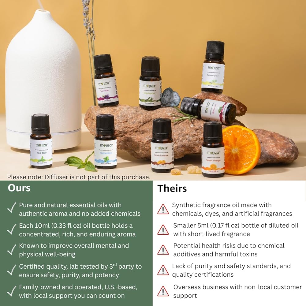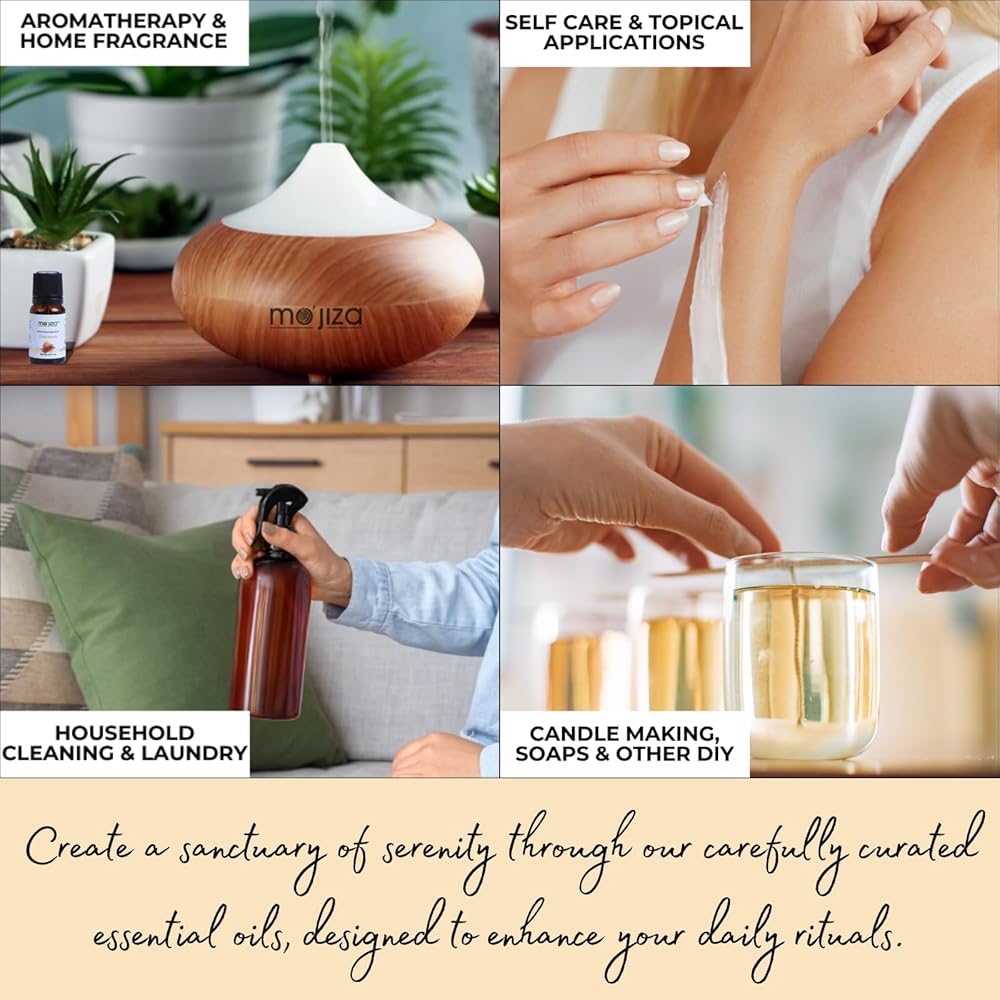 جودة نقية وطبيعية: استمتع بنقاء زيوت موجيزا العطرية - طبيعية تمامًا وخالية من أي مواد صناعية أو عطور صناعية. تحتوي كل زجاجة على زيت علاجي غير مخفف فقط مصنوع من أجل رفاهيتك الشاملة.