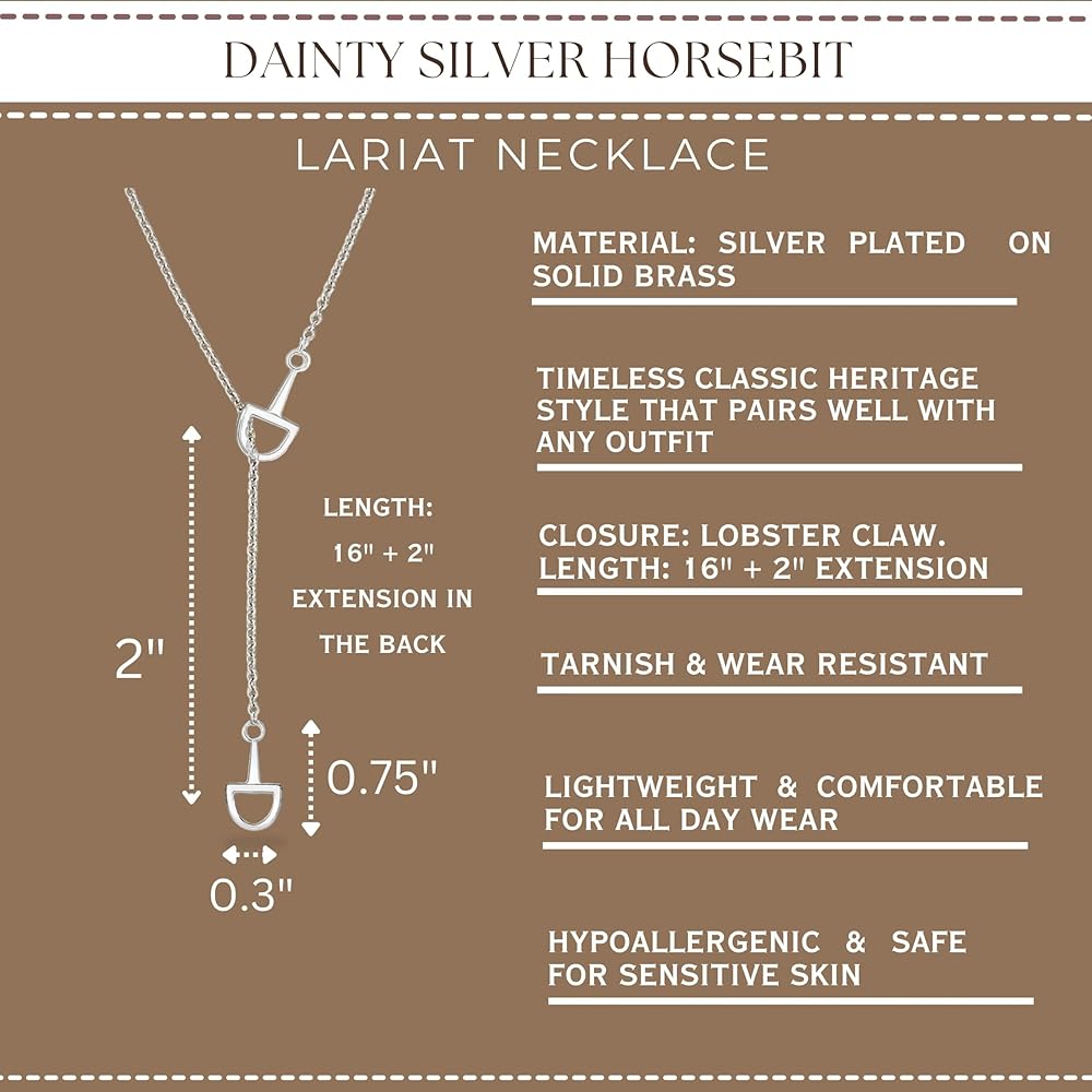 Elevate your everyday style with this Dainty Silver or Gold Horsebit Lariat Necklace, a refined piece inspired by classic equestrian design and modern minimalism. Crafted from silver plated solid brass, this necklace features two delicate horsebit-inspired charms connected by a sleek, fine chain, creating a graceful Y-shaped lariat silhouette with timeless appeal. Designed to sit beautifully along the neckline, the lariat drop adds subtle movement and a softly sculpted finish that feels elegant yet effortless. The necklace measures 16 inches with a 2-inch extension, allowing for adjustable styling and easy layering. Finished with a secure lobster claw clasp, it offers both comfort and reliability for daily wear. Lightweight and smooth against the skin, this piece is ideal for all-day comfort. The slim chain and petite horsebit details deliver a clean, understated look that pairs seamlessly with casual outfits, tailored ensembles, and western-inspired styling. Whether worn alone as a delicate statement or layered with other minimalist necklaces, it brings a sense of quiet sophistication to any jewelry collection. The polished silver tone makes this lariat necklace easy to style with existing jewelry, while the heritage-inspired motif adds character without overpowering your look. Thoughtfully designed and endlessly versatile, it's a natural fit for those drawn to refined equestrian accents and modern, wearable jewelry. Care Tip: To maintain shine, gently wipe with a smooth, soft non-abrasive cloth after wear and avoid prolonged exposure to water, lotions, and soaps.