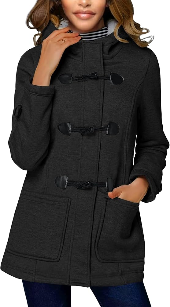 Women's winter thicken coat with zipper and button closure, double warmth, hooded collar and fleece lining keeps wind and warm. Unique horn button placket design and fit tailoring, fashionable and cute, highlighting your charming figure. Women fleece jackets hood design, provides extra protection and warmth for your head. Adding a touch of uniqueness to your wardrobe, our jacket boasts a stylish toggle button that's perfect for both everyday wear and outdoor adventures.
