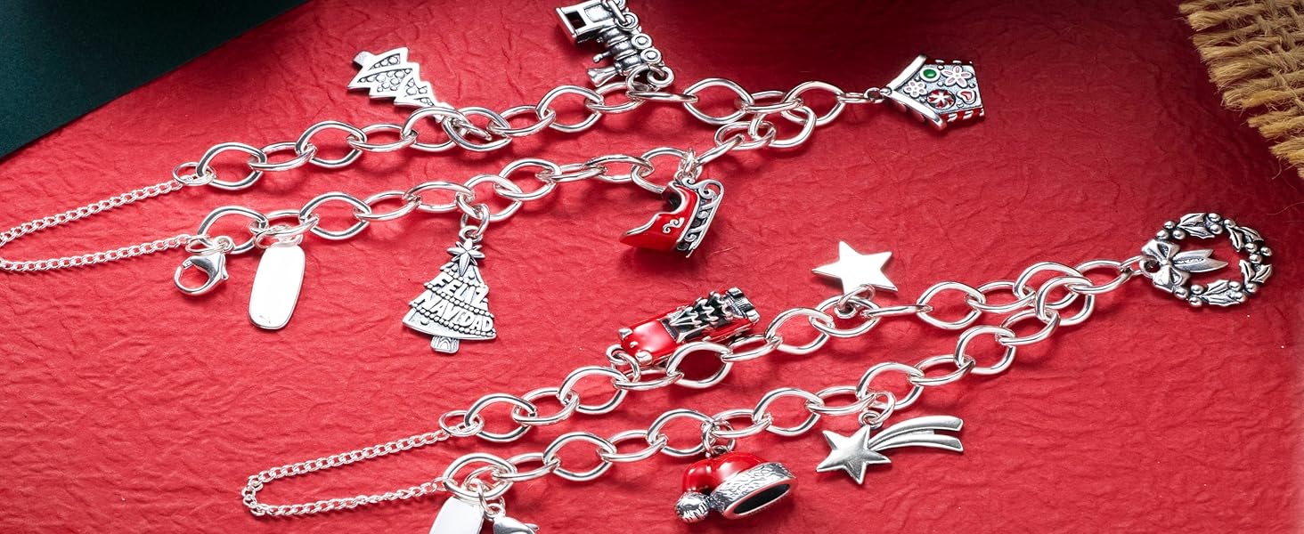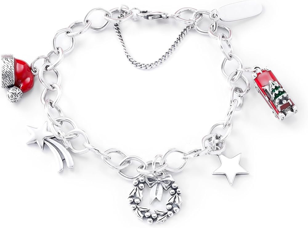 استمتع بروح عيد الميلاد مع هذا السوار الساحر من JA. مصنوعة من الفضة الإسترلينية، وتتميز بسحر العطلات الساحر: شجرة عيد الميلاد المفصلة، وقطار كلاسيكي، وبيت خبز الزنجبيل الملون، وزلاجة حمراء. تضمن السلسلة القابلة للتعديل ملاءمة مثالية. مثالية كهدية احتفالية أو لإضافة لمسة عطلة إلى مجموعة مجوهراتك.
