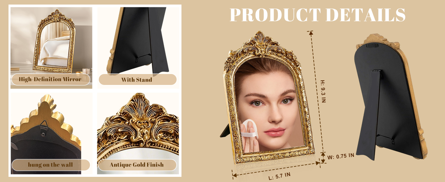 تصميم مدمج وموفر للمساحة بقياس 9.3 × 5.7 بوصة، تتناسب هذه المرآة خفيفة الوزن بسهولة مع الخزانات أو الزينة أو الأرفف الضيقة، بينما يضمن إطارها القوي من الراتنج المتانة. سهل النقل أو التعليق أو العرض في أي مكان.