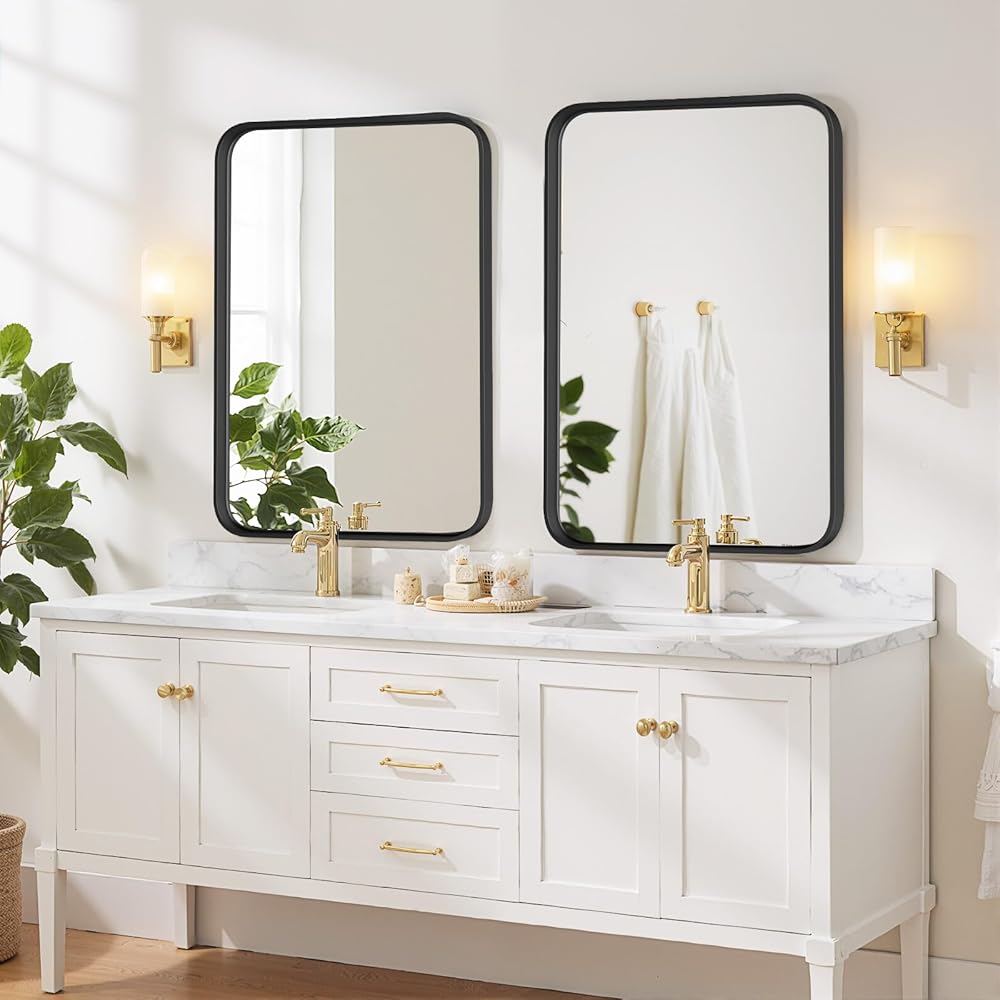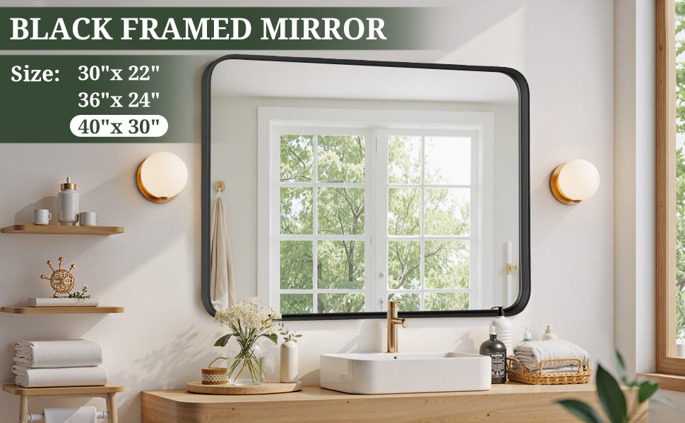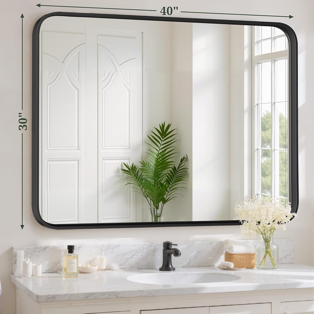 Bathroom Mirror 40x30 Inch Black Metal Frame Rectangle Vanity Mirror with Rounded Corners, Modern Wall Mounted Anti-Rust Mirror for Farmhouse, Restroom, Entryway, Horizontal or Vertical Hanging