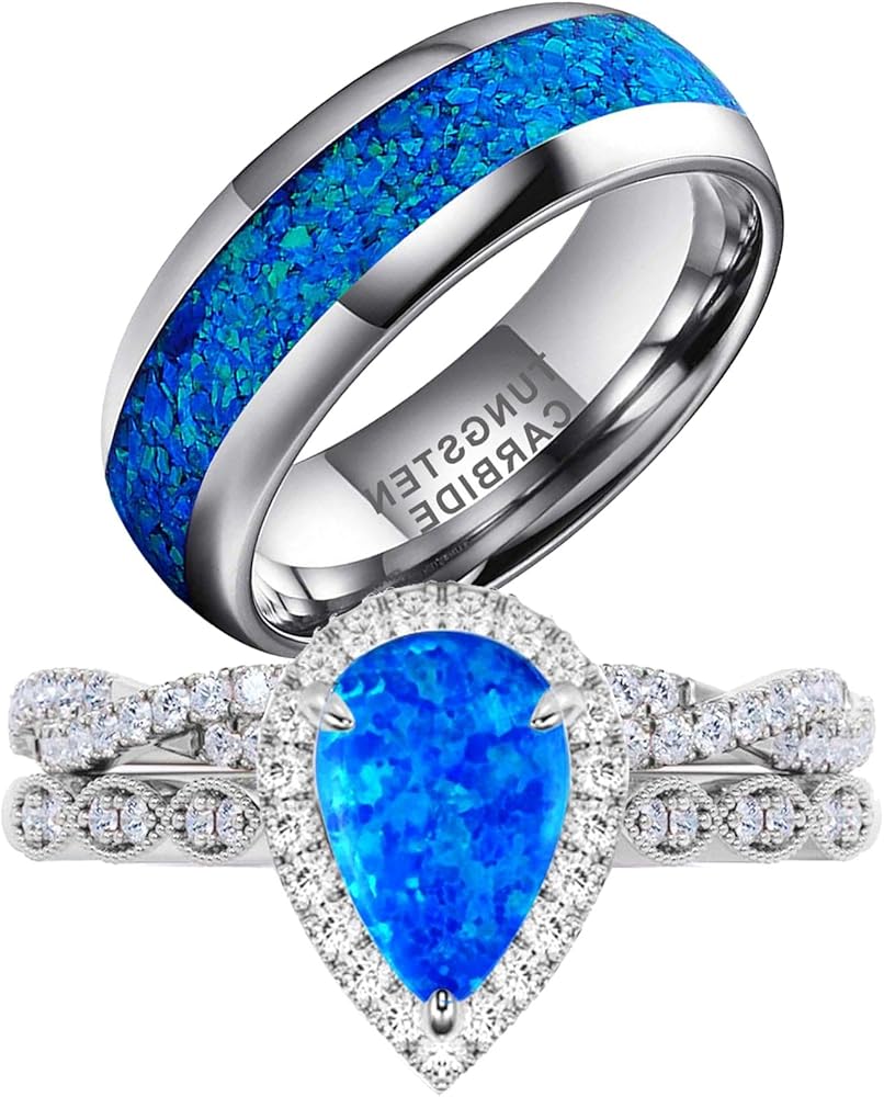 Material: Women's ring - blue opal 925 Sterling Silver with gold plating; Men's ring - tungsten steel with blue opal.