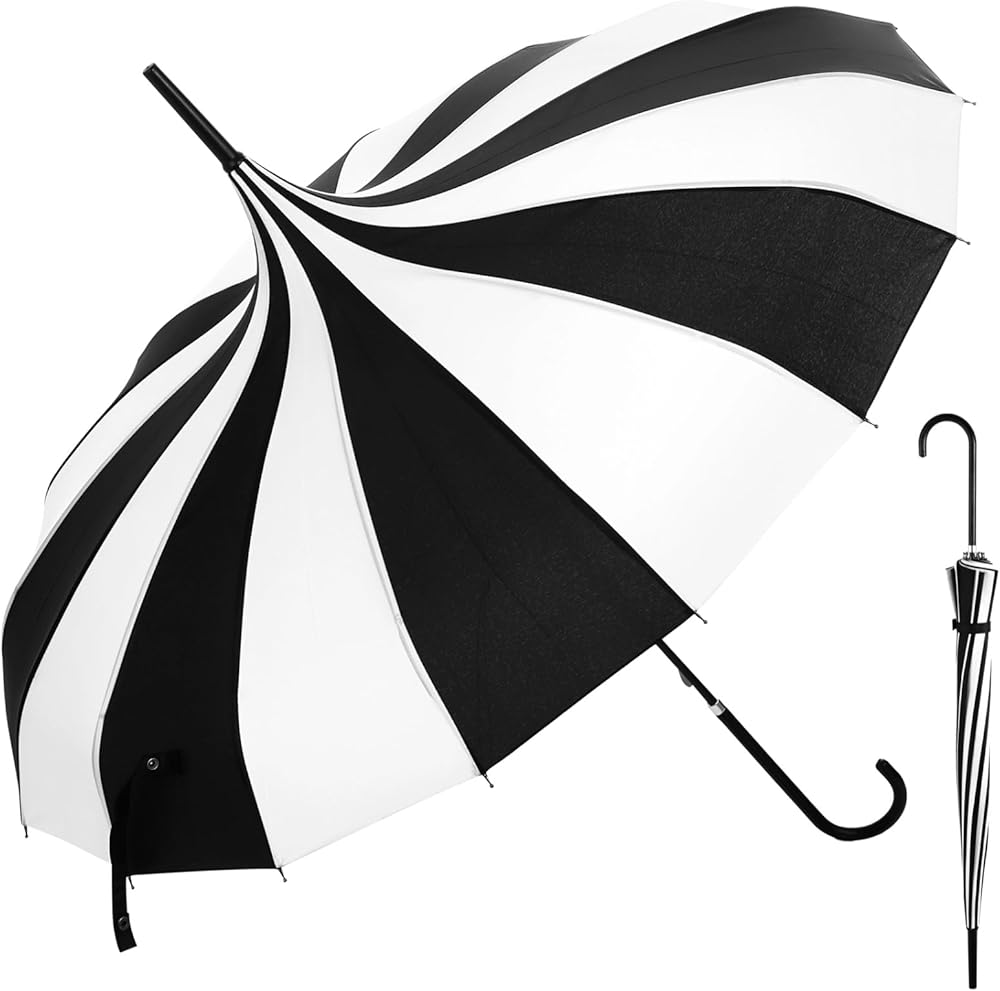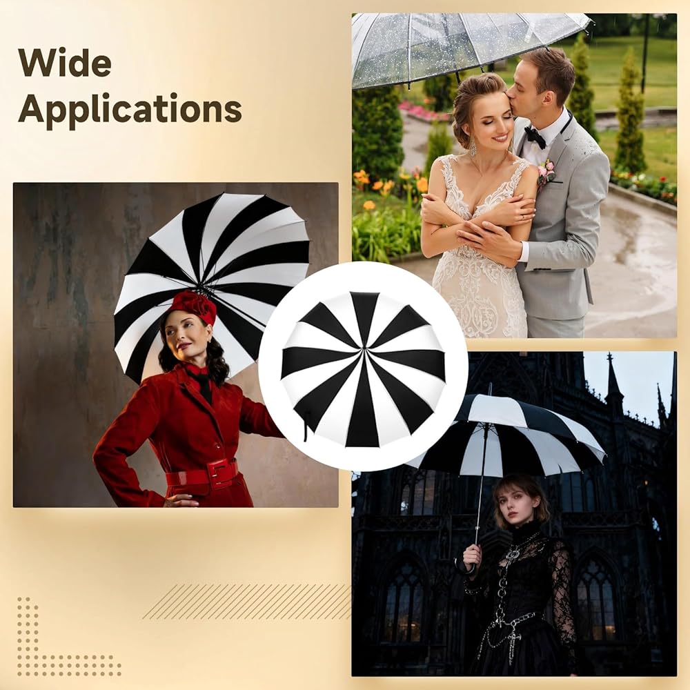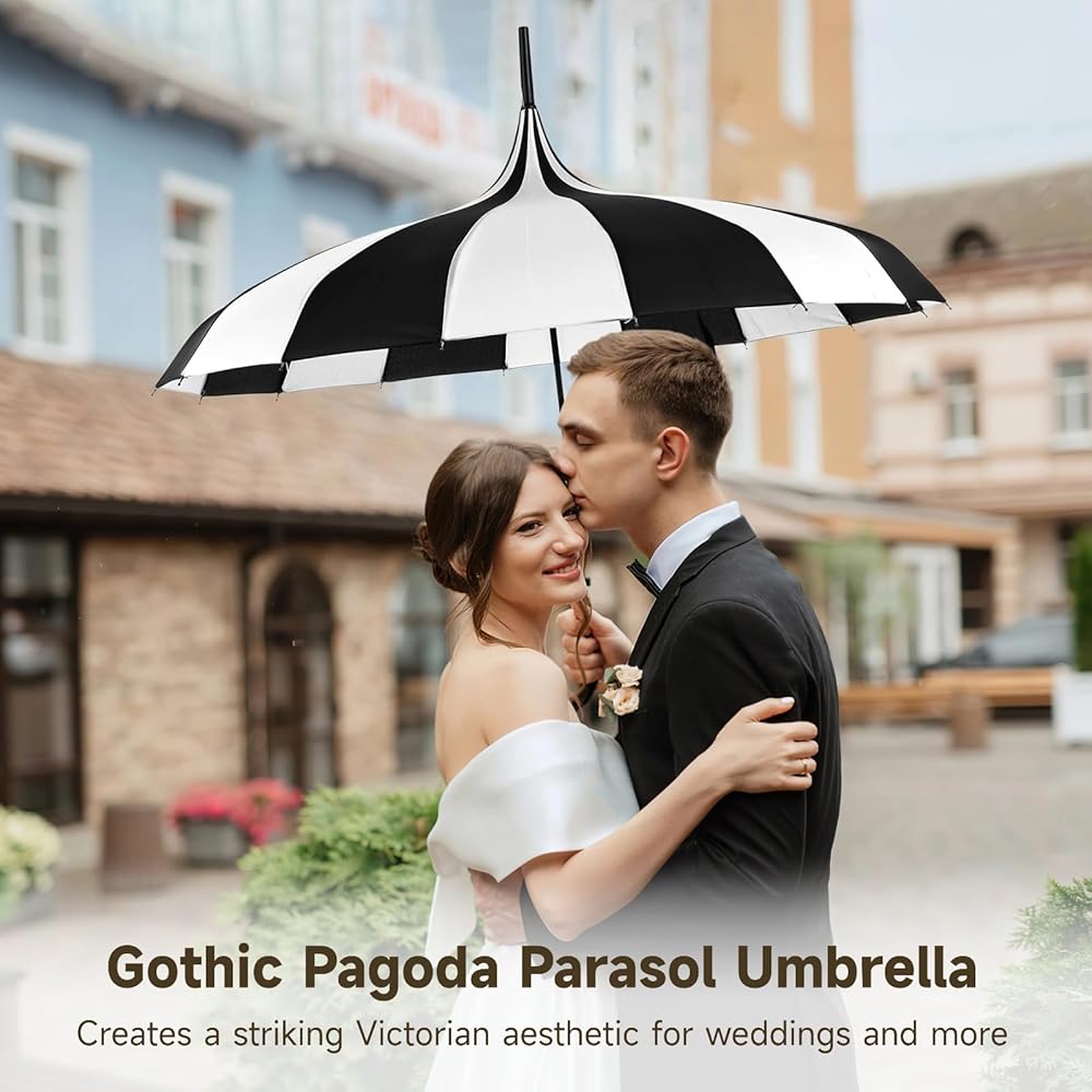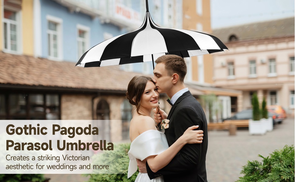 • 【Gothic Pagoda Silhouette】 Designed as a pagoda style umbrella with a gothic parasol umbrella look, the curved canopy creates a vintage umbrella profile inspired by Victorian fashion, making it suitable for weddings, themed photoshoots, cosplay styling, and outdoor visual displays