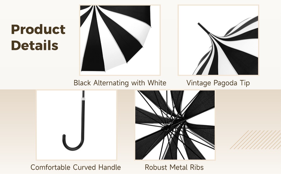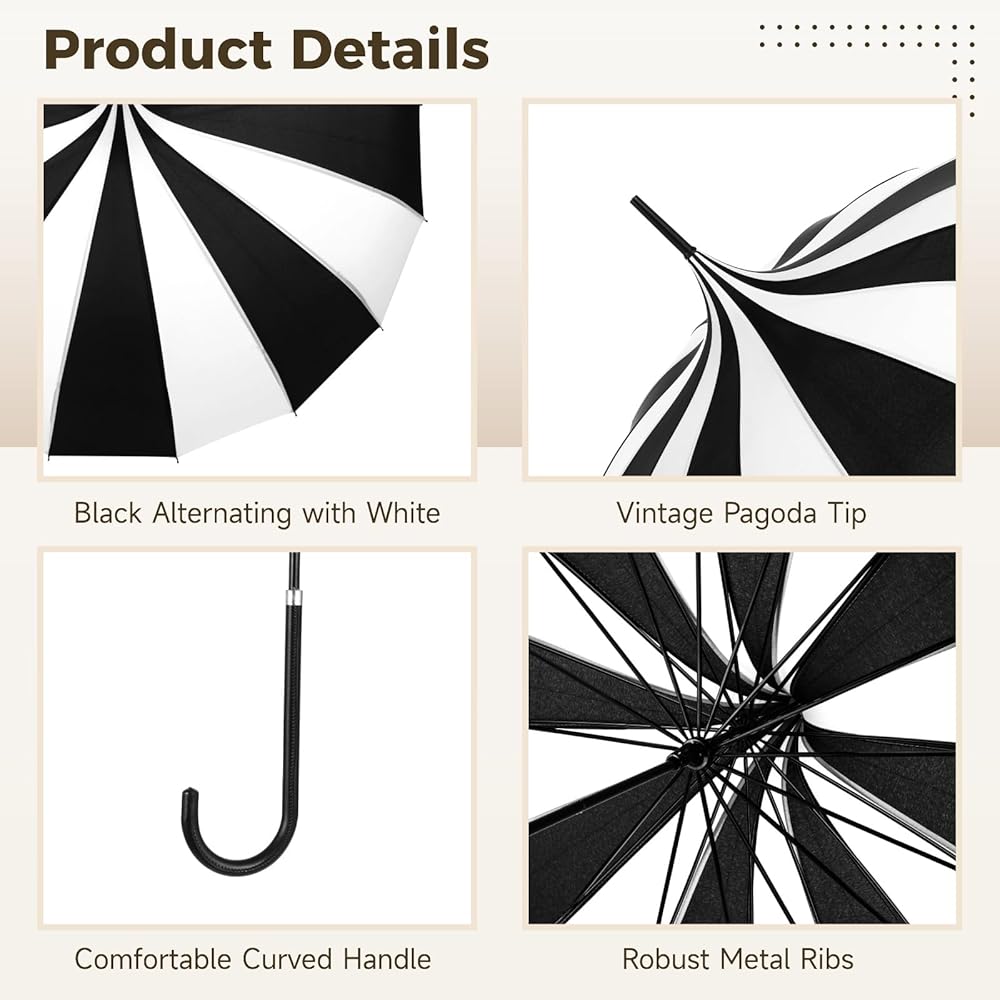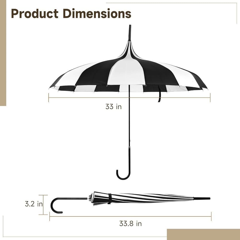 Classic Structure and Handling: Built as an umbrella with hook handle, the curved grip allows balanced control and easy carrying. The steel frame and metal ribs support the canopy shape, making this pagoda style umbrella stable during walking, posing, or light wind conditions.