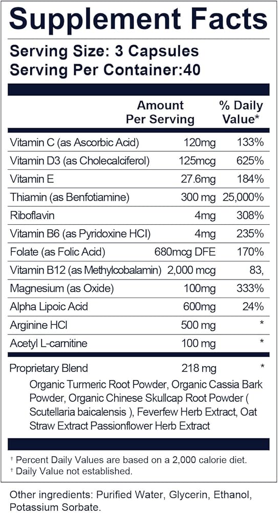 تركيبة متقدمة مضادة للأكسدة: تحتوي على 1200 ملجم من حمض ألفا ليبويك (ALA)، و300 ملجم من البنفوتيامين، وغيرها من العناصر الغذائية الرئيسية، هذا المزيج المصمم علميًا يعمل بشكل تآزري لتعزيز صحة الأعصاب والرفاهية العامة.