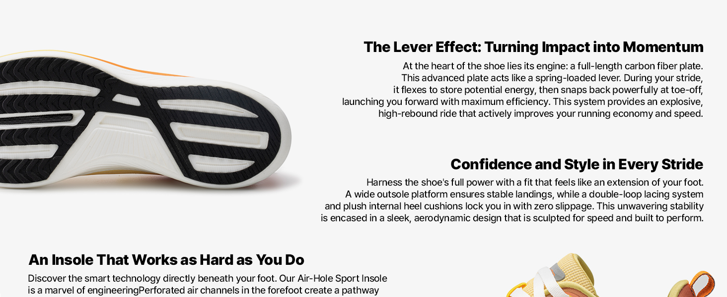 أطلق العنان لسرعتك: تعمل لوحة الكربون المدمجة لدينا بمثابة زنبرك قوي، مما يزيد من الدفع وإعادة الطاقة لمساعدتك على الجري بشكل أسرع وأكثر كفاءة، من التدريب إلى يوم السباق.