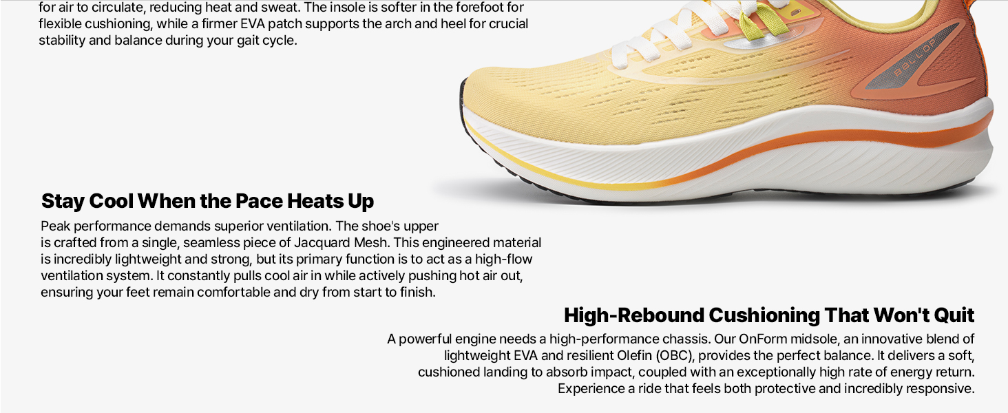 تهوية متقدمة: الجزء العلوي من شبكة الجاكار بالكامل يسمح للحرارة بالهروب، بينما يعزز النعل الداخلي المصنوع من الفيلون المثقوب بالهواء تدفق الهواء الفائق، مما يحافظ على قدميك باردة وجافة ومريحة أثناء الجري المكثف.