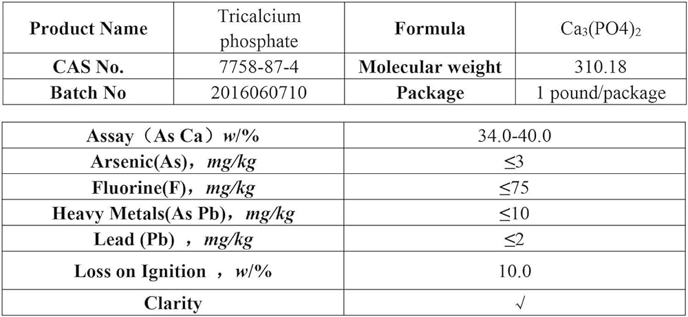 - CAS: 7758-87-4؛ الصيغة الجزيئية: Ca3(PO4)2؛ الوزن الجزيئي هو 310.18.