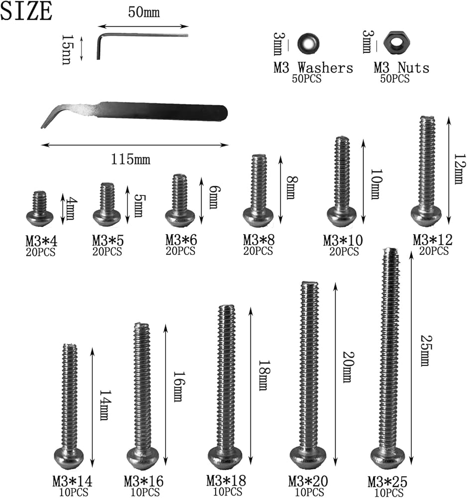 تحتوي العبوة على: 20 قطعة - M3 * 4 مم 20 قطعة - M3 * 5 مم 20 قطعة - M3 * 6 مم 20 قطعة - M3 * 8 مم 20 قطعة - M3 * 10 مم 20 قطعة - M3 * 12 مم 10 قطعة - M3 * 14 مم 10 قطعة - M3 * 16 مم 10 قطعة-M3 * 18 مللي متر 10 قطعة-M3 * 20 مللي متر 10 قطعة-M3 * 25 مللي متر