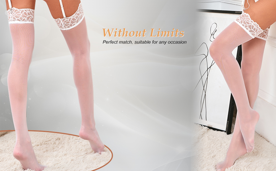 تصميم أنيق من الدانتيل: يضيف الجزء العلوي من الدانتيل لمسة من الأناقة إلى هذه الجوارب الشفافة عالية الفخذ، مما يجعلها مثالية للملابس الكاجوال والرسمية.