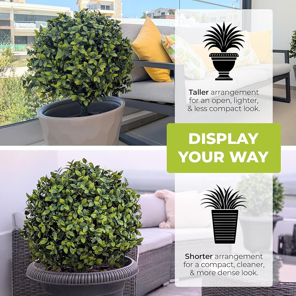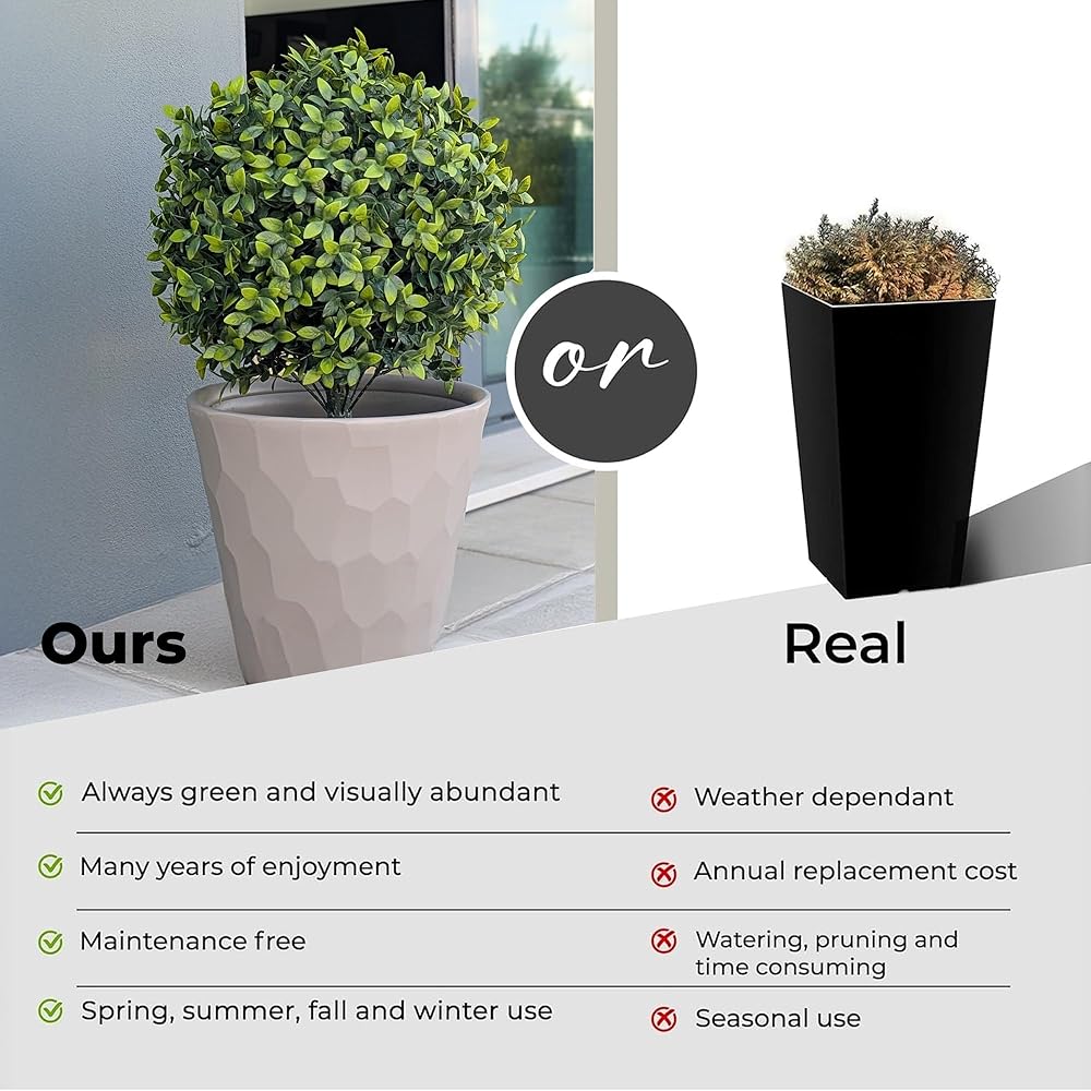 ليس الجزء العلوي المتوسط الخاص بك - كل ورقة مصنوعة بدقة، تحاكي خشب البقس الحقيقي للحصول على مظهر كامل وحيوي وطبيعي. يحافظ الارتفاع الأرضي المتكامل على خضرتك آمنة ومستقيمة خلال كل موسم. استمتع بجاذبية الرصيف الخصبة دون عناء دون رفع إصبعك. لا سقي. لا التشذيب. لا يوجد فوضى، فقط طراز يدوم طويلاً خلال كل موسم.