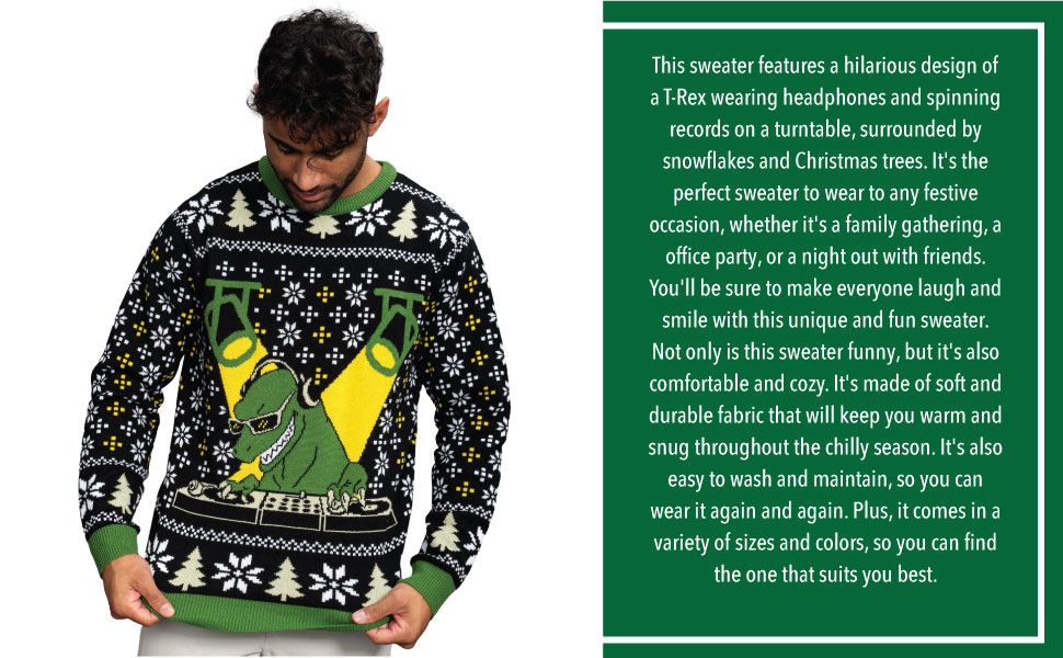 Perfect for holiday parties, this sweater will not only keep you warm but also make you the talk of the event. Crafted from premium materials, it ensures comfort while making a bold style statement. Whether you're spinning tunes at a party or enjoying a cozy evening by the fireplace, let this T-Rex DJ set the mood for your festive celebrations!