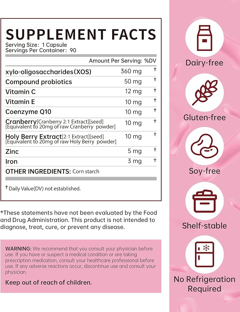 سهل البلع: لا يحتوي على منتجات الألبان أو الصويا أو الغلوتين. تناول كبسولة واحدة يوميًا لتناسب نمط حياتك المزدحم وروتين العناية الحميمة